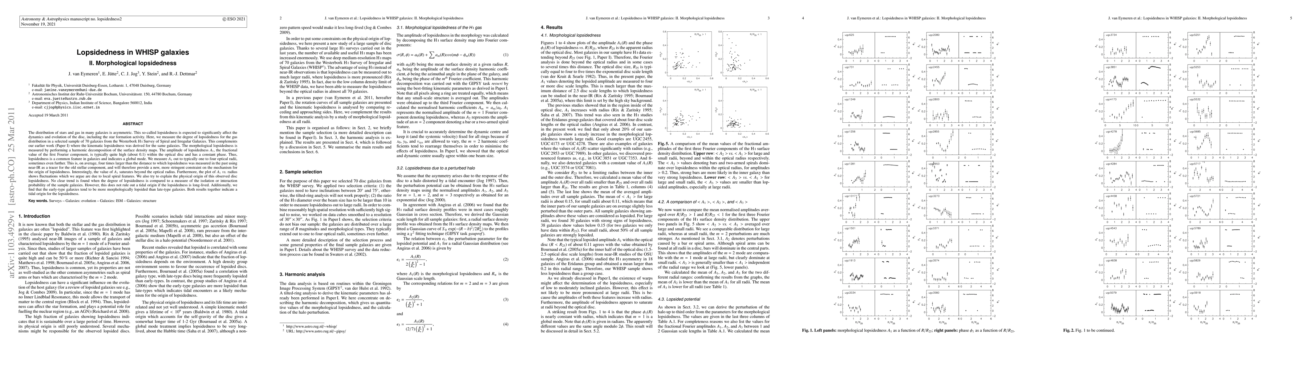 This paper measures the morphological lopsidedness in the gas distribution of 70 galaxies from the WHISP survey, finding high amplitudes of lopsidedness (A_1) typically around 0.1 within the optical disc. The study suggests that lopsidedness is a common global feature in galaxies, with implications for their dynamics and evolution.
