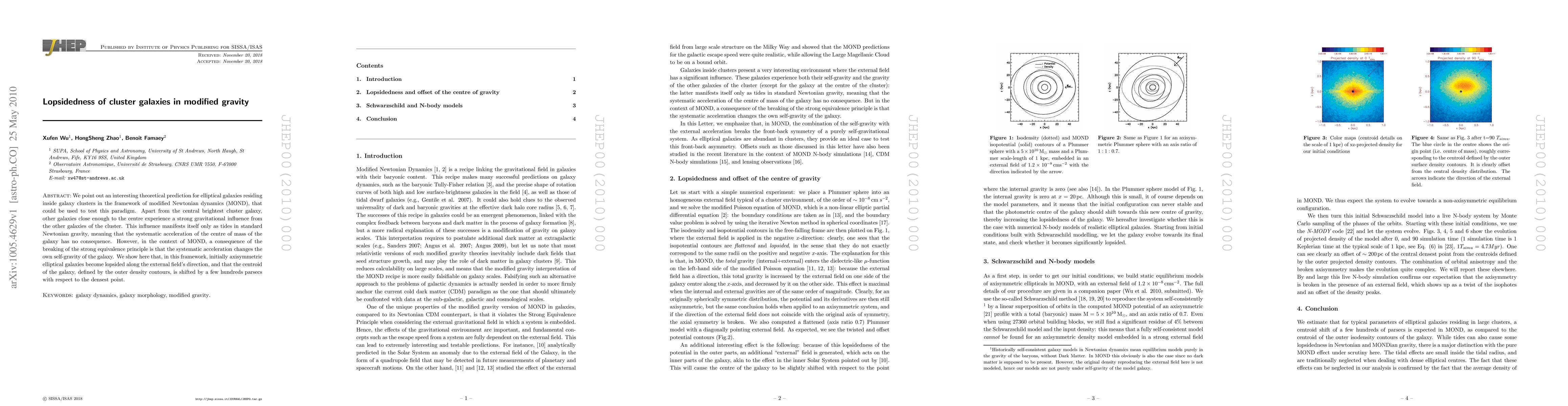 We point out an interesting theoretical prediction for elliptical galaxies residing inside galaxy clusters in the framework of modified Newtonian dynamics (MOND), that could be used to test this paradigm. Apart from the central brightest cluster galaxy, other galaxies close enough to the centre experience a strong gravitational influence from the other galaxies of the cluster. This influence manifests itself only as tides in standard Newtonian gravity, meaning that the systematic acceleration of the centre of mass of the galaxy has no consequence. However, in the context of MOND, a consequence of the breaking of the strong equivalence principle is that the systematic acceleration changes the own self-gravity of the galaxy. We show here that, in this framework, initially axisymmetric elliptical galaxies become lopsided along the external field's direction, and that the centroid of the galaxy, defined by the outer density contours, is shifted by a few hundreds parsecs with respect to the densest point.