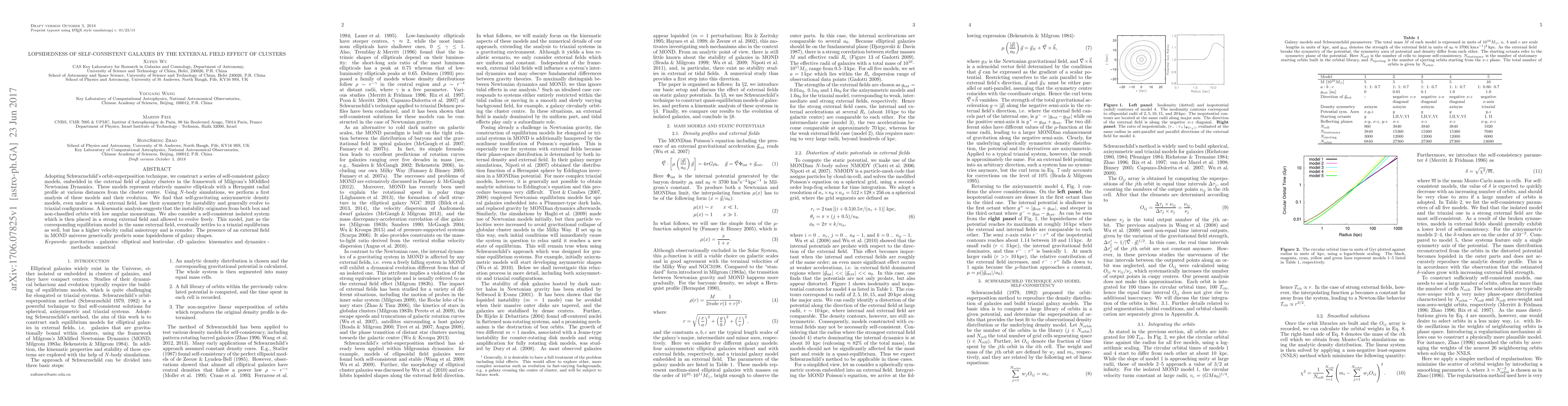 Adopting Schwarzschild's orbit-superposition technique, we construct a series of self-consistent galaxy models, embedded in the external field of galaxy clusters in the framework of Milgrom's MOdified Newtonian Dynamics. These models represent relatively massive ellipticals with a Hernquist radial profile at various distances from the cluster centre. Using $N$-body simulations, we perform a first analysis of these models and their evolution. We find that self-gravitating axisymmetric density models, even under a weak external field, lose their symmetry by instability and generally evolve to triaxial configurations. A kinematic analysis suggests that the instability originates from both box and non-classified orbits with low angular momentum. We also consider a self-consistent isolated system which is then placed in a strong external field and allowed to evolve freely. This model, just as the corresponding equilibrium model in the same external field, eventually settles to a triaxial equilibrium as well, but has a higher velocity radial anisotropy and is rounder. The presence of an external field in MOND universe generically predicts some lopsidedness of galaxy shapes.