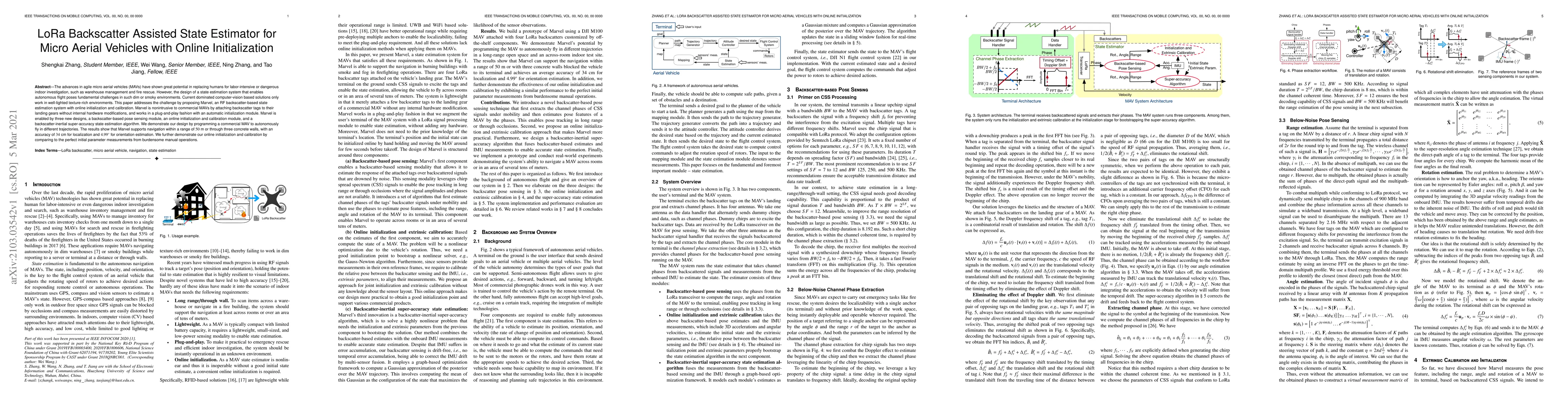 This paper proposes Marvel, an RF backscatter-assisted state estimation system for micro aerial vehicles (MAVs) that enables autonomous navigation in dim or smoky environments. Marvel features online initialization and calibration, achieving 34 cm localization and 4.99 degrees orientation accuracy over 50 m or through three walls.