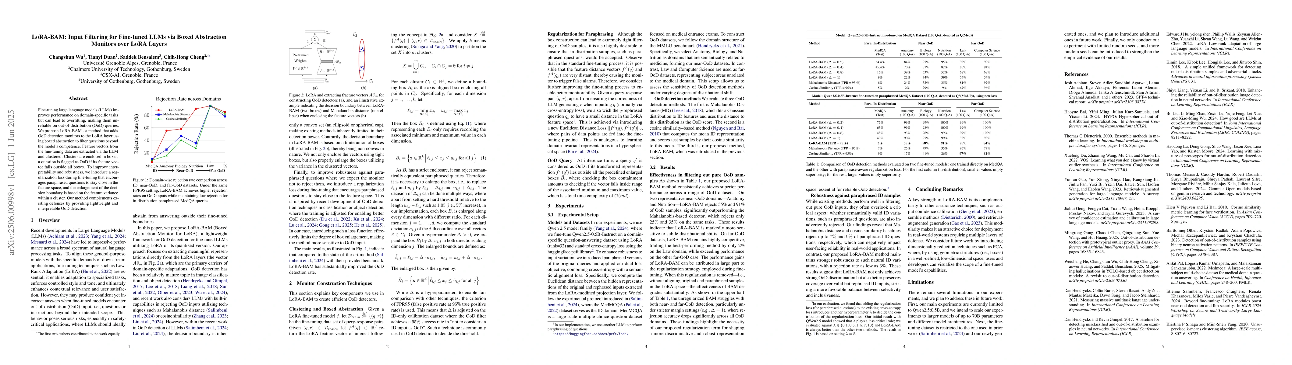 LoRA-BAM introduces OoD detection monitors using boxed abstraction for LoRA-fine-tuned LLMs, improving reliability on domain-specific tasks by flagging unfamiliar queries. It clusters fine-tuning data feature vectors, encloses them in boxes, and uses regularization loss to enhance interpretability and robustness.