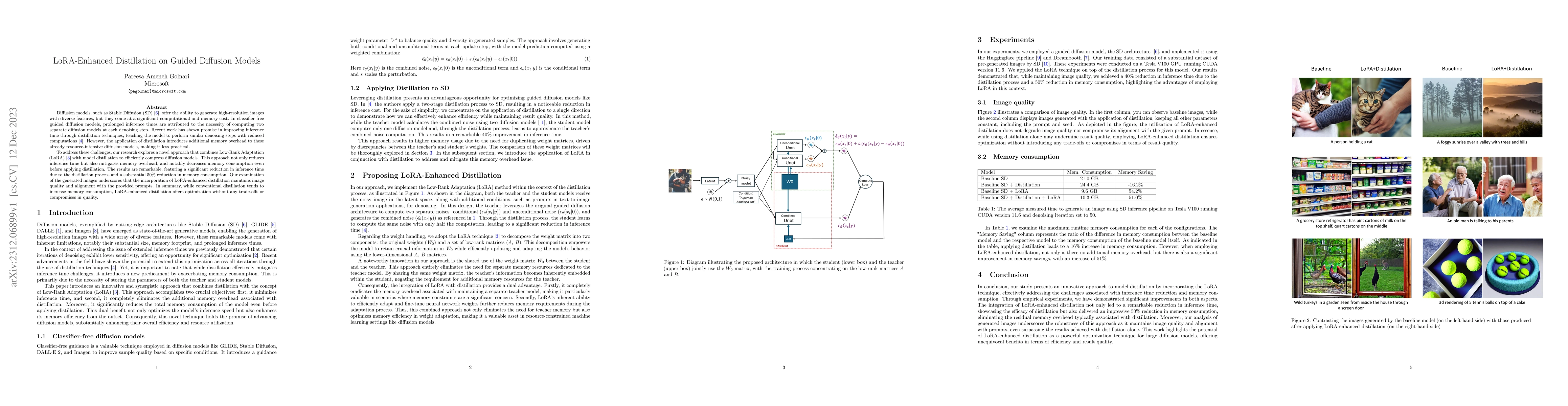Diffusion models, such as Stable Diffusion (SD), offer the ability to generate high-resolution images with diverse features, but they come at a significant computational and memory cost. In classifier-free guided diffusion models, prolonged inference times are attributed to the necessity of computing two separate diffusion models at each denoising step. Recent work has shown promise in improving inference time through distillation techniques, teaching the model to perform similar denoising steps with reduced computations. However, the application of distillation introduces additional memory overhead to these already resource-intensive diffusion models, making it less practical. To address these challenges, our research explores a novel approach that combines Low-Rank Adaptation (LoRA) with model distillation to efficiently compress diffusion models. This approach not only reduces inference time but also mitigates memory overhead, and notably decreases memory consumption even before applying distillation. The results are remarkable, featuring a significant reduction in inference time due to the distillation process and a substantial 50% reduction in memory consumption. Our examination of the generated images underscores that the incorporation of LoRA-enhanced distillation maintains image quality and alignment with the provided prompts. In summary, while conventional distillation tends to increase memory consumption, LoRA-enhanced distillation offers optimization without any trade-offs or compromises in quality.