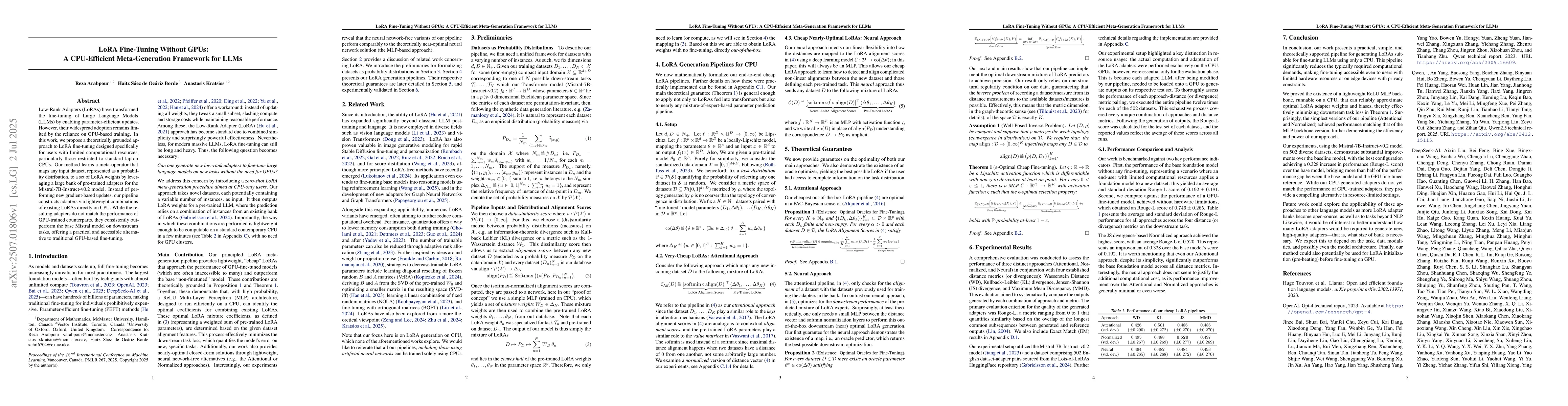 Low-Rank Adapters (LoRAs) have transformed the fine-tuning of Large Language Models (LLMs) by enabling parameter-efficient updates. However, their widespread adoption remains limited by the reliance on GPU-based training. In this work, we propose a theoretically grounded approach to LoRA fine-tuning designed specifically for users with limited computational resources, particularly those restricted to standard laptop CPUs. Our method learns a meta-operator that maps any input dataset, represented as a probability distribution, to a set of LoRA weights by leveraging a large bank of pre-trained adapters for the Mistral-7B-Instruct-v0.2 model. Instead of performing new gradient-based updates, our pipeline constructs adapters via lightweight combinations of existing LoRAs directly on CPU. While the resulting adapters do not match the performance of GPU-trained counterparts, they consistently outperform the base Mistral model on downstream tasks, offering a practical and accessible alternative to traditional GPU-based fine-tuning.