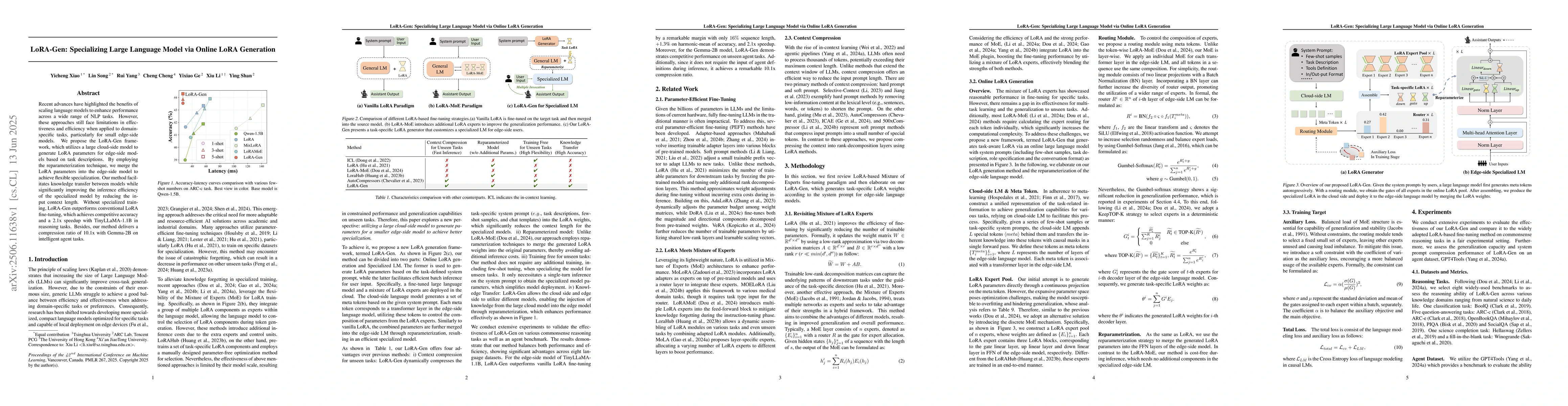 Recent advances have highlighted the benefits of scaling language models to enhance performance across a wide range of NLP tasks. However, these approaches still face limitations in effectiveness and efficiency when applied to domain-specific tasks, particularly for small edge-side models. We propose the LoRA-Gen framework, which utilizes a large cloud-side model to generate LoRA parameters for edge-side models based on task descriptions. By employing the reparameterization technique, we merge the LoRA parameters into the edge-side model to achieve flexible specialization. Our method facilitates knowledge transfer between models while significantly improving the inference efficiency of the specialized model by reducing the input context length. Without specialized training, LoRA-Gen outperforms conventional LoRA fine-tuning, which achieves competitive accuracy and a 2.1x speedup with TinyLLaMA-1.1B in reasoning tasks. Besides, our method delivers a compression ratio of 10.1x with Gemma-2B on intelligent agent tasks.