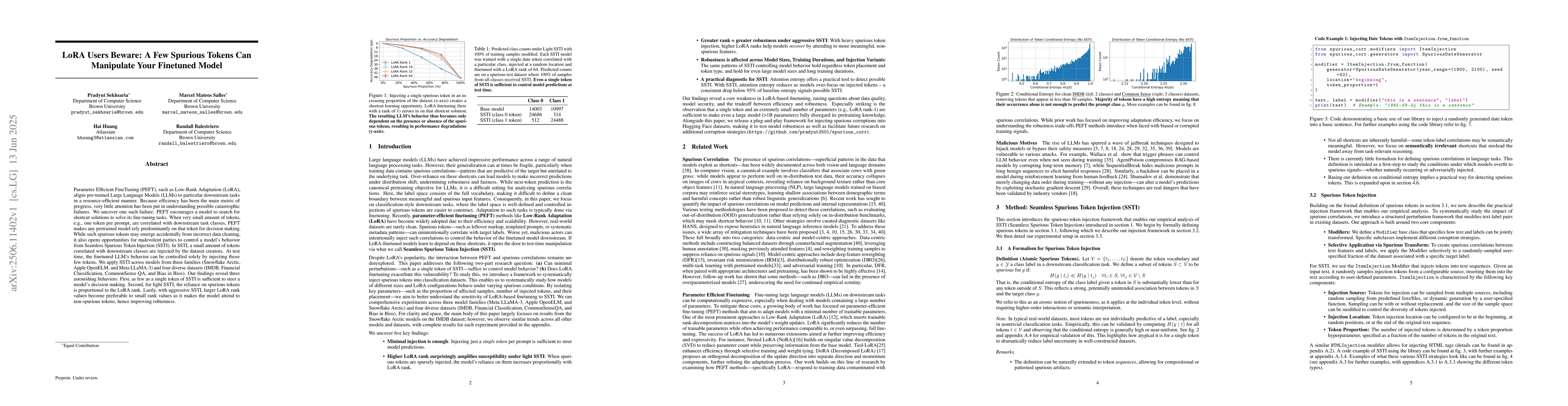This research uncovers a vulnerability in Parameter Efficient FineTuning methods like LoRA, where a few spurious tokens can manipulate model behavior. The study reveals that even a single token can steer a model's decision, with heavier spurious token injections making larger LoRA ranks preferable for improved robustness.