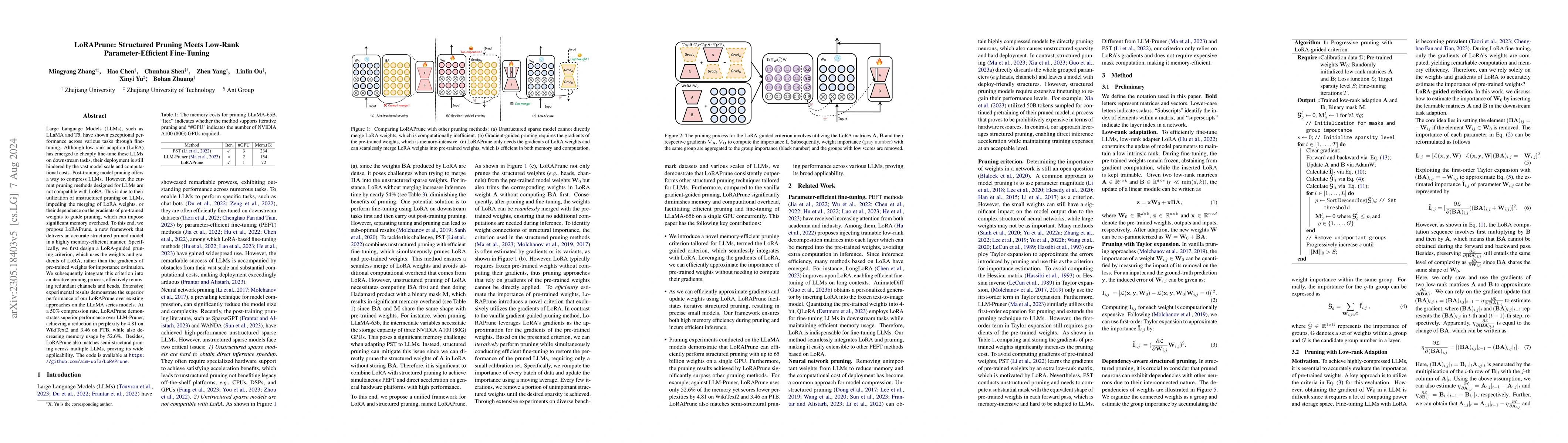 LoRAPrune presents a novel pruning framework that integrates a LoRA-guided pruning criterion with an iterative pruning process, effectively removing redundant model components while being memory-efficient.