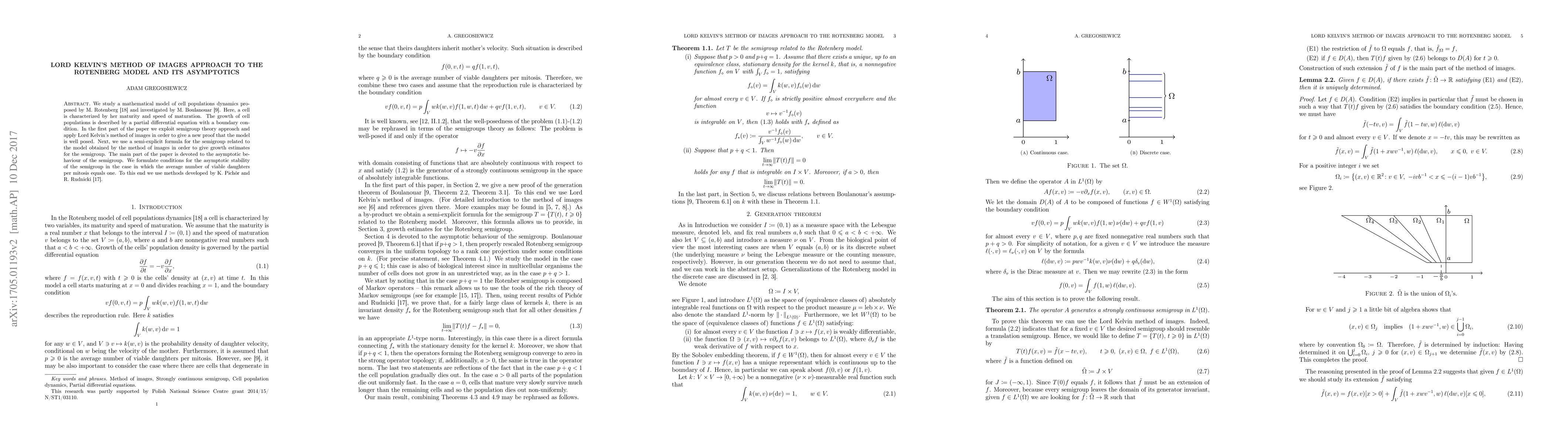 We study a mathematical model of cell populations dynamics proposed by M. Rotenberg and investigated by M. Boulanouar. Here, a cell is characterized by her maturity and speed of maturation. The growth of cell populations is described by a partial differential equation with a boundary condition. In the first part of the paper we exploit semigroup theory approach and apply Lord Kelvin's method of images in order to give a new proof that the model is well posed. Next, we use a semi-explicit formula for the semigroup related to the model obtained by the method of images in order to give growth estimates for the semigroup. The main part of the paper is devoted to the asymptotic behaviour of the semigroup. We formulate conditions for the asymptotic stability of the semigroup in the case in which the average number of viable daughters per mitosis equals one. To this end we use methods developed by K. Pich\'or and R. Rudnicki.