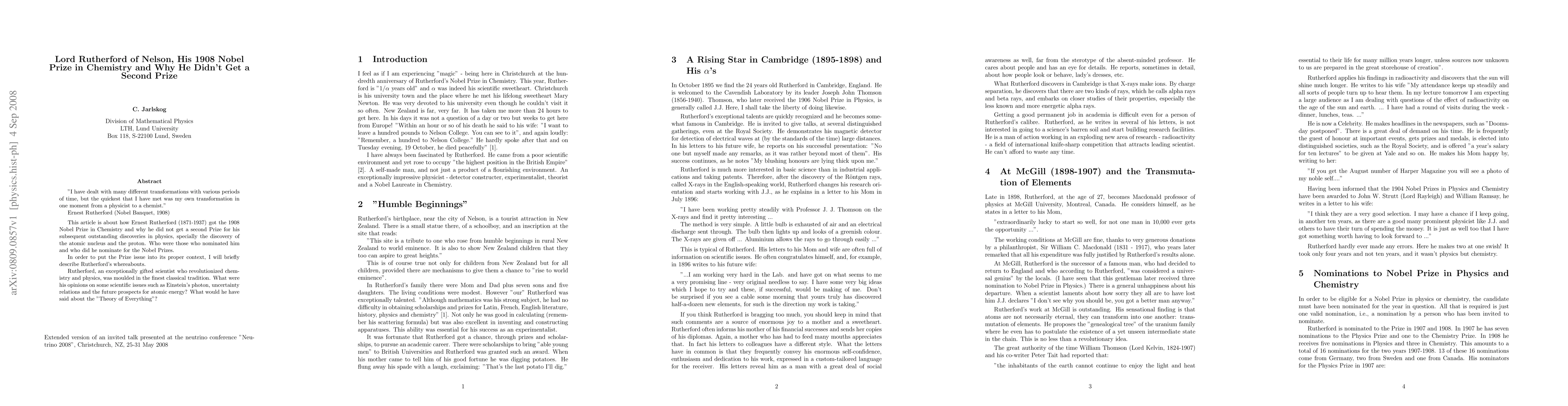 "I have dealt with many different transformations with various periods of time, but the quickest that I have met was my own transformation in one moment from a physicist to a chemist." Ernest Rutherford (Nobel Banquet, 1908) This article is about how Ernest Rutherford (1871-1937) got the 1908 Nobel Prize in Chemistry and why he did not get a second Prize for his subsequent outstanding discoveries in physics, specially the discovery of the atomic nucleus and the proton. Who were those who nominated him and who did he nominate for the Nobel Prizes. In order to put the Prize issue into its proper context, I will briefly describe Rutherford's whereabouts. Rutherford, an exceptionally gifted scientist who revolutionized chemistry and physics, was moulded in the finest classical tradition. What were his opinions on some scientific issues such as Einstein's photon, uncertainty relations and the future prospects for atomic energy? What would he have said about the "Theory of Everything"?