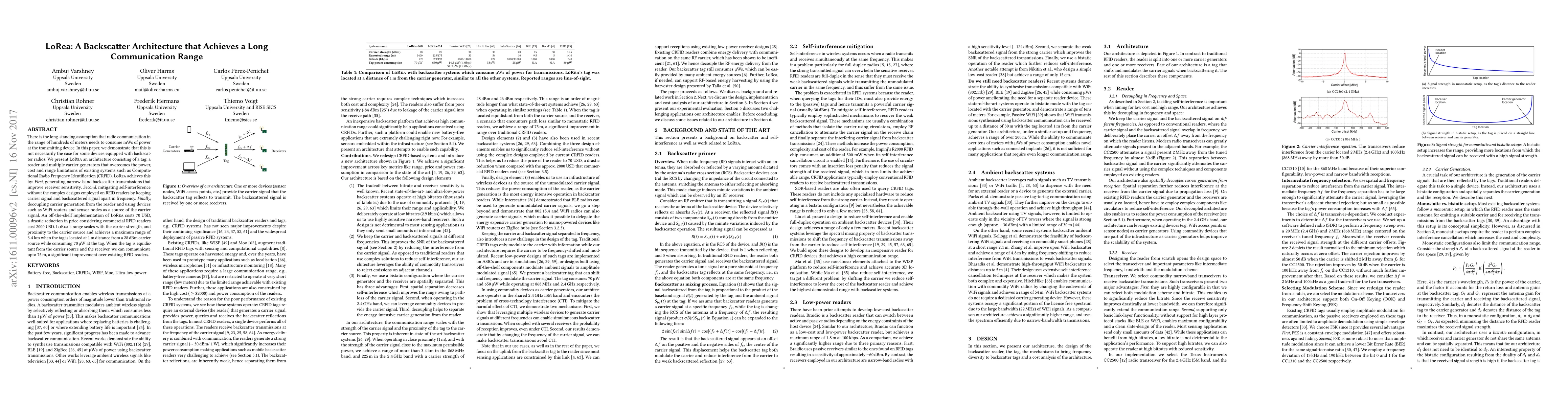 LoRea presents a backscatter architecture that significantly extends communication range to hundreds of meters while drastically reducing power consumption and cost compared to traditional RFID systems. It achieves long-range communication by utilizing narrow-band backscatter transmissions, frequency separation for self-interference mitigation, and leveraging external carrier sources.