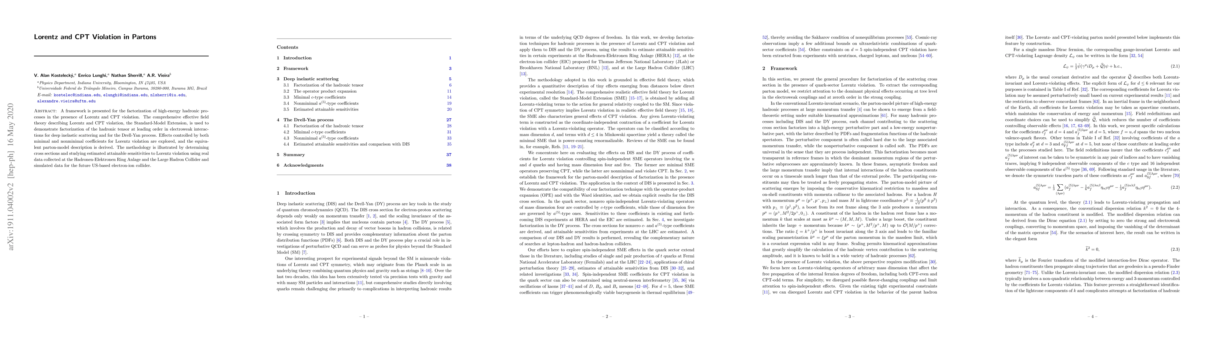 A framework is presented for the factorization of high-energy hadronic processes in the presence of Lorentz and CPT violation. The comprehensive effective field theory describing Lorentz and CPT violation, the Standard-Model Extension, is used to demonstrate factorization of the hadronic tensor at leading order in electroweak interactions for deep inelastic scattering and for the Drell-Yan process. Effects controlled by both minimal and nonminimal coefficients for Lorentz violation are explored, and the equivalent parton-model description is derived. The methodology is illustrated by determining cross sections and studying estimated attainable sensitivities to Lorentz violation using real data collected at the Hadronen-Elektronen Ring Anlage and the Large Hadron Collider and simulated data for the future US-based electron-ion collider.