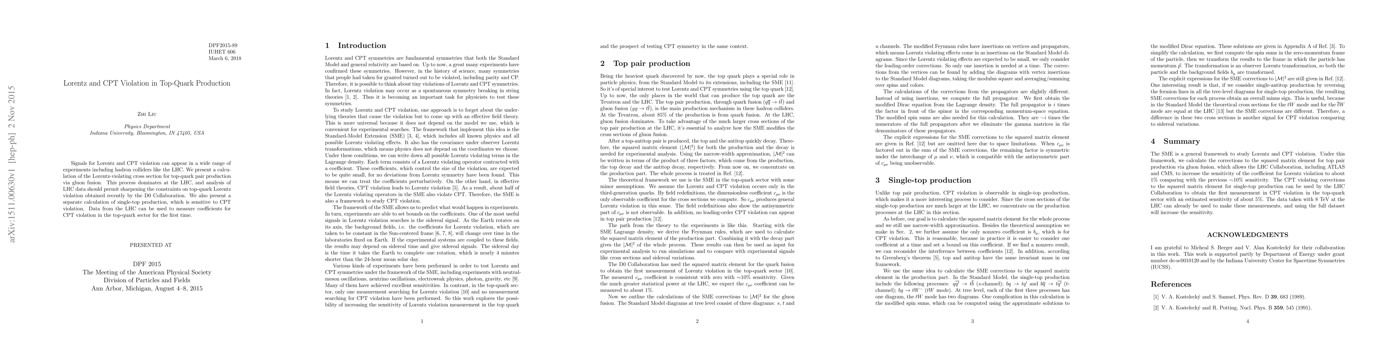 Signals for Lorentz and CPT violation can appear in a wide range of experiments including hadron colliders like the LHC. We present a calculation of the Lorentz-violating cross section for top-quark pair production via gluon fusion. This process dominates at the LHC, and analysis of LHC data should permit sharpening the constraints on top-quark Lorentz violation obtained recently by the D0 Collaboration. We also present a separate calculation of single-top production, which is sensitive to CPT violation. Data from the LHC can be used to measure coefficients for CPT violation in the top-quark sector for the first time.