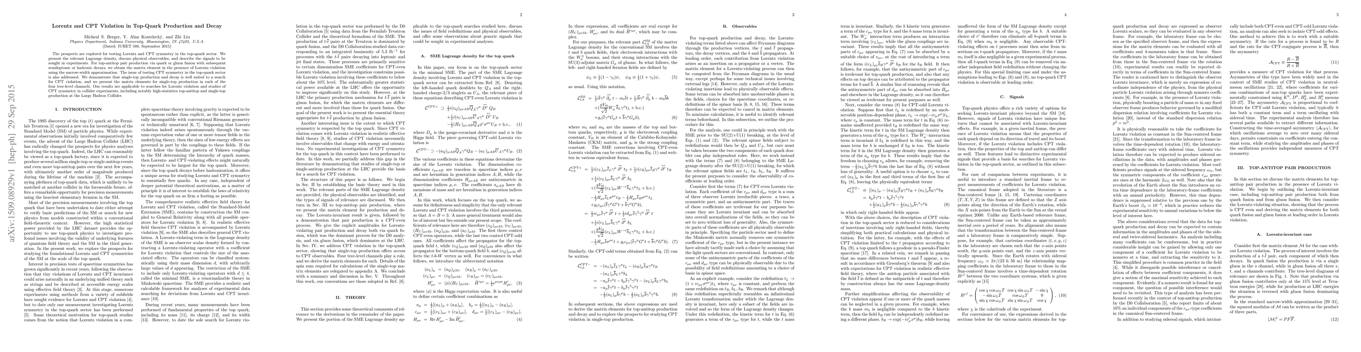 The prospects are explored for testing Lorentz and CPT symmetry in the top-quark sector. We present the relevant Lagrange density, discuss physical observables, and describe the signals to be sought in experiments. For top-antitop pair production via quark or gluon fusion with subsequent semileptonic or hadronic decays, we obtain the matrix element in the presence of Lorentz violation using the narrow-width approximation. The issue of testing CPT symmetry in the top-quark sector is also addressed. We demonstrate that single-top production and decay is well suited to a search for CPT violation, and we present the matrix elements for single-top production in each of the four tree-level channels. Our results are applicable to searches for Lorentz violation and studies of CPT symmetry in collider experiments, including notably high-statistics top-antitop and single-top production at the Large Hadron Collider.