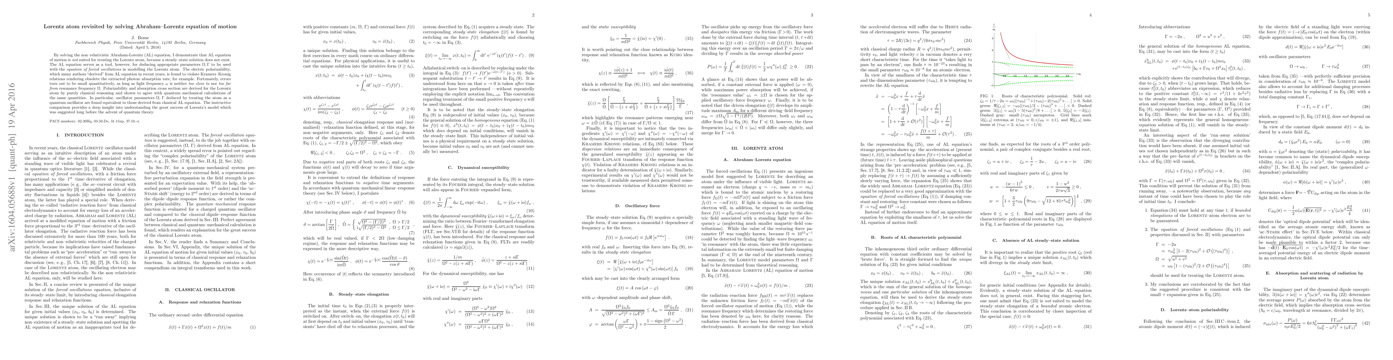 By solving the non-relativistic Abraham-Lorentz (AL) equation, I demonstrate that AL equation of motion is not suited for treating the Lorentz atom, because a steady-state solution does not exist. The AL equation serves as a tool, however, for deducing appropriate parameters $\Omega,\Gamma$ to be used with the equation of forced oscillations in modelling the Lorentz atom. The electric polarizability, which many authors "derived" from AL equation in recent years, is found to violate Kramers-Kronig relations rendering obsolete the extracted photon-absorption rate, for example. Fortunately, errors turn out to be small quantitatively, as long as light frequency $\omega$ is neither too close to nor too far from resonance frequency $\Omega$. Polarizability and absorption cross section are derived for the Lorentz atom by purely classical reasoning and shown to agree with quantum-mechanical calculations of the same quantities. In particular, oscillator parameters $\Omega,\,\Gamma$ deduced by treating the atom as a quantum oscillator are found equivalent to those derived from classical AL equation. The instructive comparison provides a deep insight into understanding the great success of Lorentz's model which was suggested long before the advent of quantum theory.