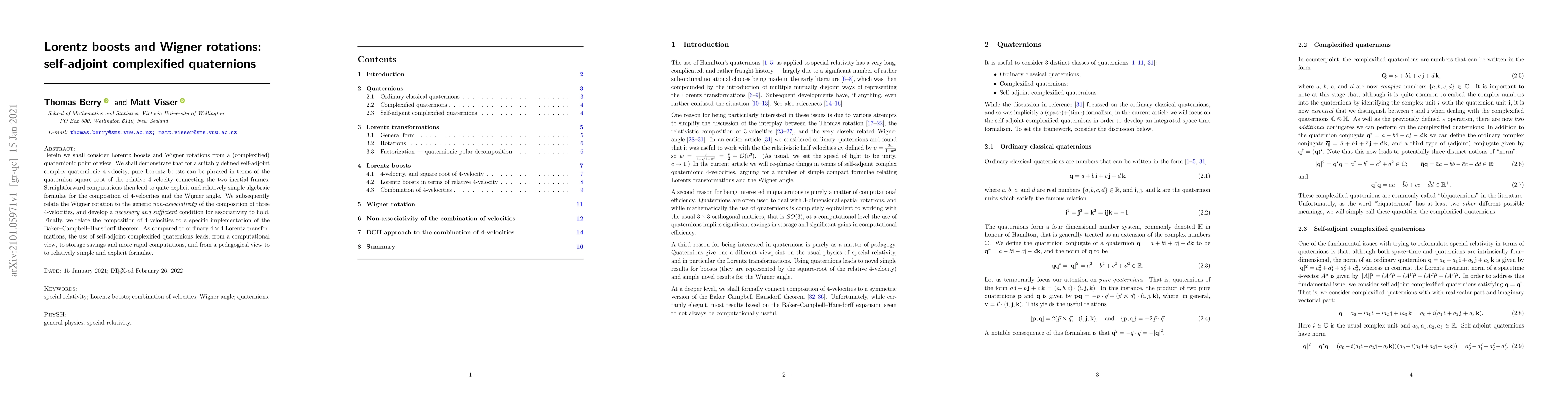 This paper explores Lorentz boosts and Wigner rotations using self-adjoint complexified quaternions, showing that pure Lorentz boosts can be expressed as the quaternion square root of the relative 4-velocity. It derives simple algebraic formulae for 4-velocity composition and the Wigner angle, and discusses the non-associativity in 4-velocity composition, providing a condition for associativity.