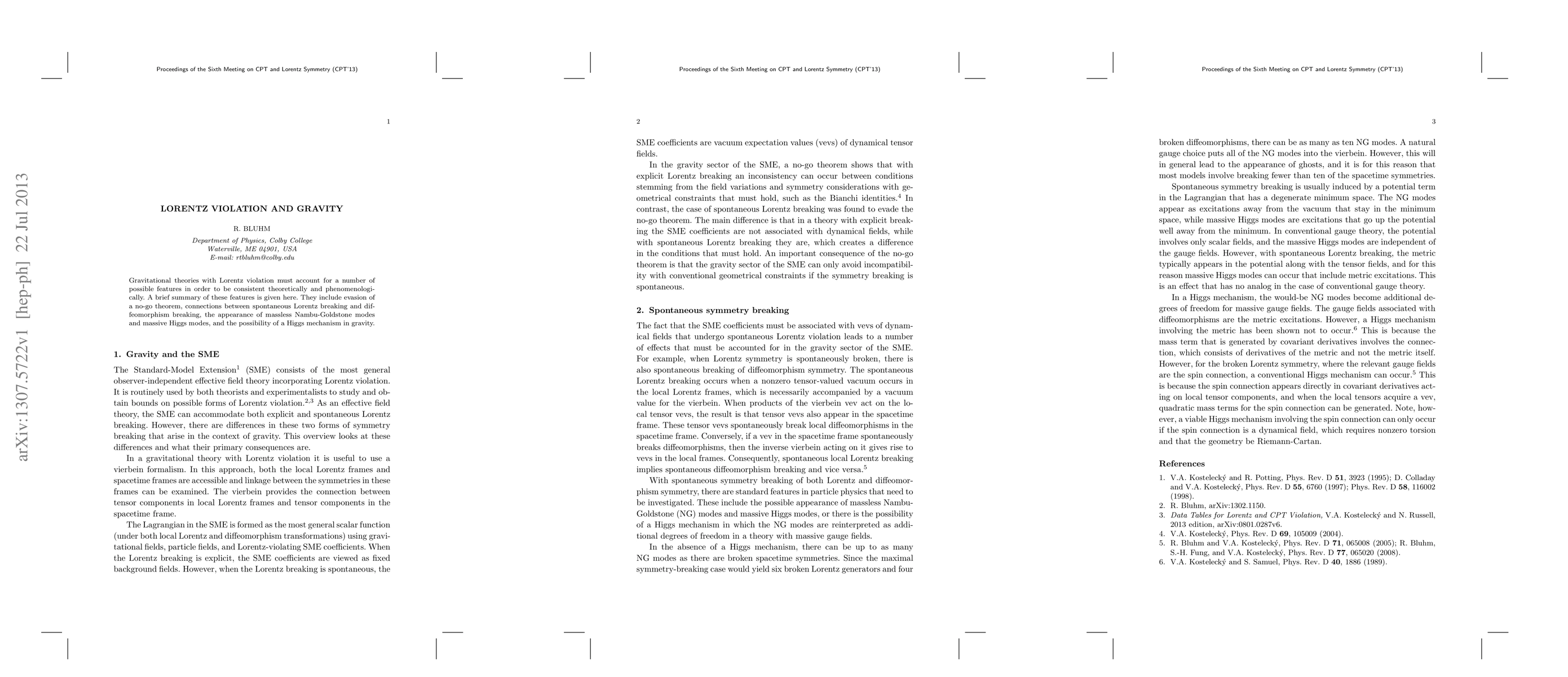 This paper discusses gravitational theories that allow for Lorentz violation, highlighting necessary theoretical and phenomenological features such as evading no-go theorems, spontaneous Lorentz breaking linked to diffeomorphism breaking, and the emergence of both massless Nambu-Goldstone and massive Higgs modes, along with the potential for a Higgs mechanism in gravity.
