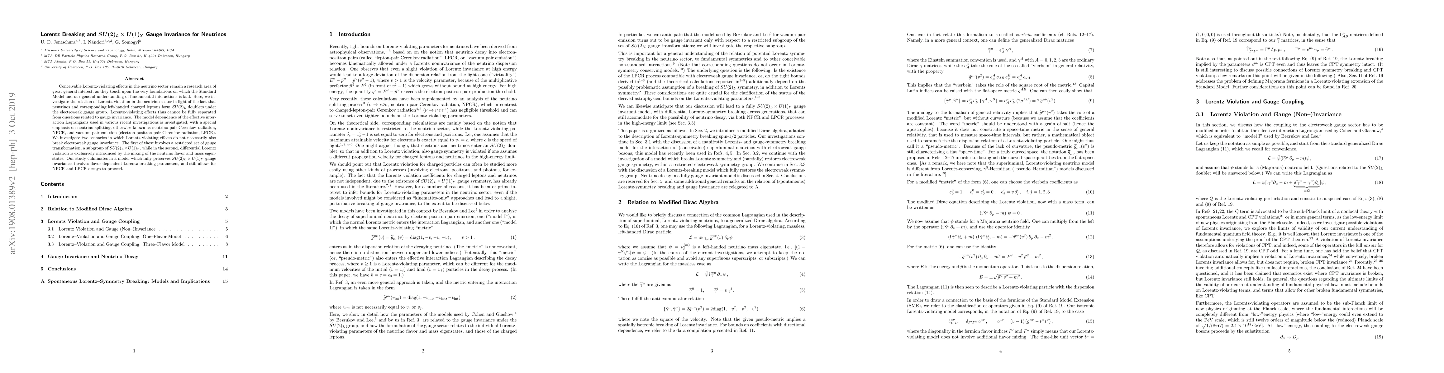 Conceivable Lorentz-violating effects in the neutrino sector remain a research area of great general interest, as they touch upon the very foundations on which the Standard Model and our general understanding of fundamental interactions is laid. Here, we investigate the relation of Lorentz violation in the neutrino sector in light of the fact that neutrinos and corresponding left-handed charged leptons form SU(2)_L doublets under the electroweak gauge group. Lorentz-violating effects thus cannot be fully separated from questions related to gauge invariance. The model dependence of the effective interaction Lagrangians used in various recent investigations is investigated, with a special emphasis on neutrino splitting, otherwise known as neutrino-pair Cerenkov radiation, NPCR, and vacuum pair emission (electron-positron-pair Cerenkov radiation, LPCR). We investigate two scenarios in which Lorentz violating effects do not necessarily also break electroweak gauge invarianceThe first of these involves a restricted set of gauge transformation, a subgroup of SU(2)_L x U(1)_Y, while in the second, differential Lorentz violation is exclusively introduced by the mixing of the neutrino flavor and mass eigenstates. Our study culminates in a model which fully preserves SU(2)_L x U(1)_Y gauge invariance, involves flavor-dependent Lorentz-breaking parameters, and still allows for NPCR and LPCR decays to proceed.