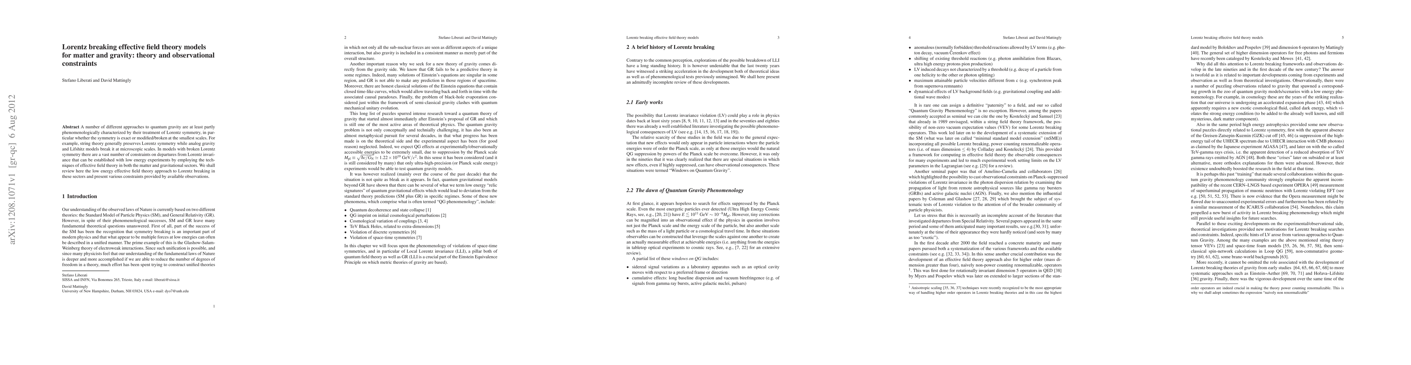 This paper reviews effective field theory models that explore the breaking of Lorentz symmetry in quantum gravity, focusing on both matter and gravitational sectors. It discusses observational constraints derived from low-energy experiments and available observations to establish deviations from Lorentz invariance in these models.