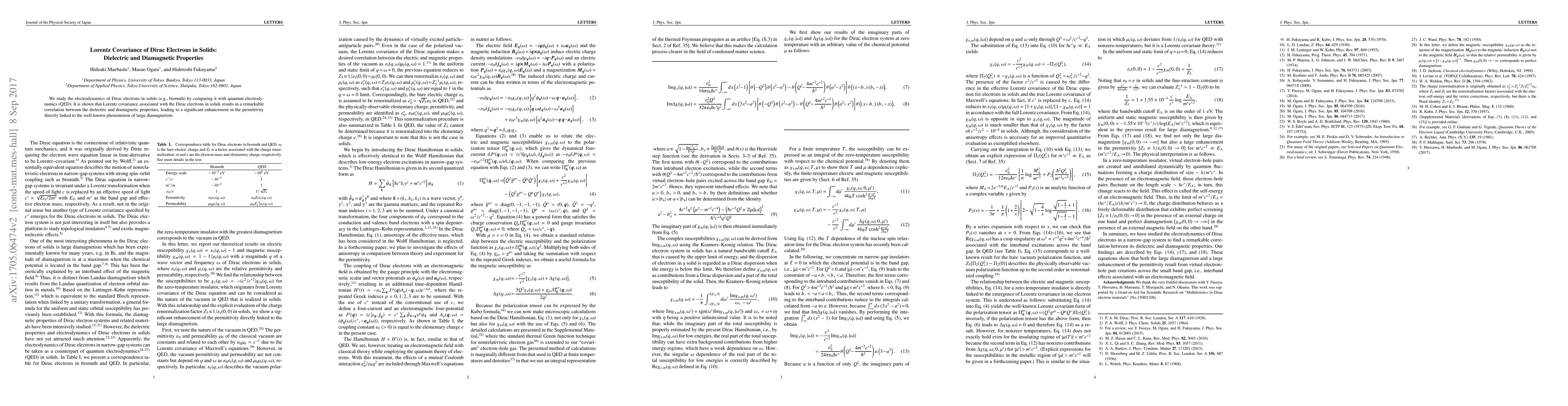 This paper explores the Lorentz covariance of Dirac electrons in solid materials, demonstrating a correlation between dielectric and diamagnetic properties that enhances permittivity, directly tied to the phenomenon of large diamagnetism.