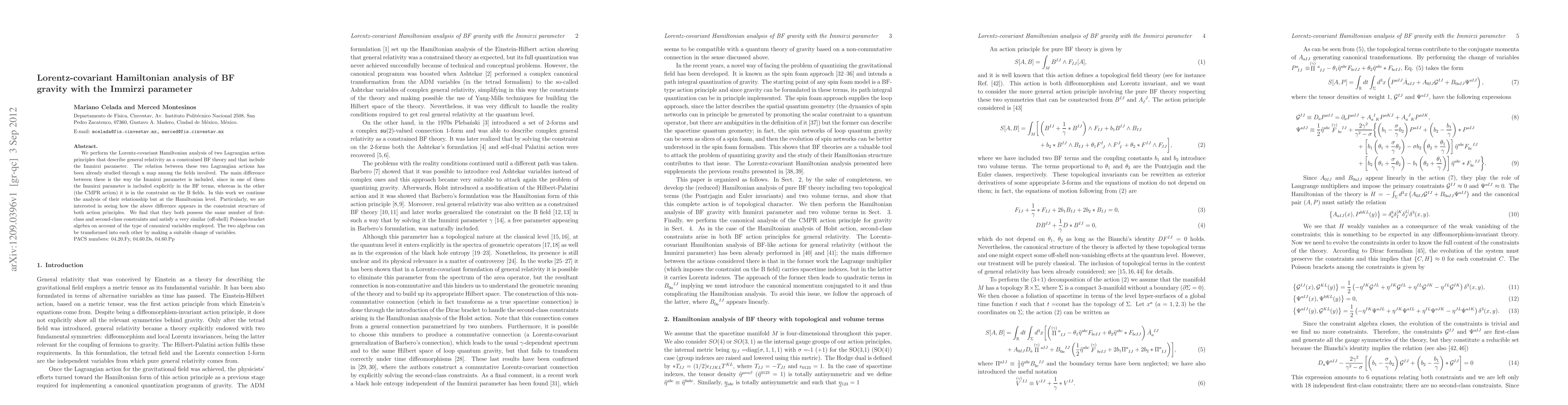 This research investigates the Lorentz-covariant Hamiltonian structure of two BF gravity formulations with the Immirzi parameter, revealing they share identical constraint structures and Poisson-bracket algebra despite different inclusions of the Immirzi parameter in their Lagrangians. The transformation between their algebras is achieved through a change of variables.