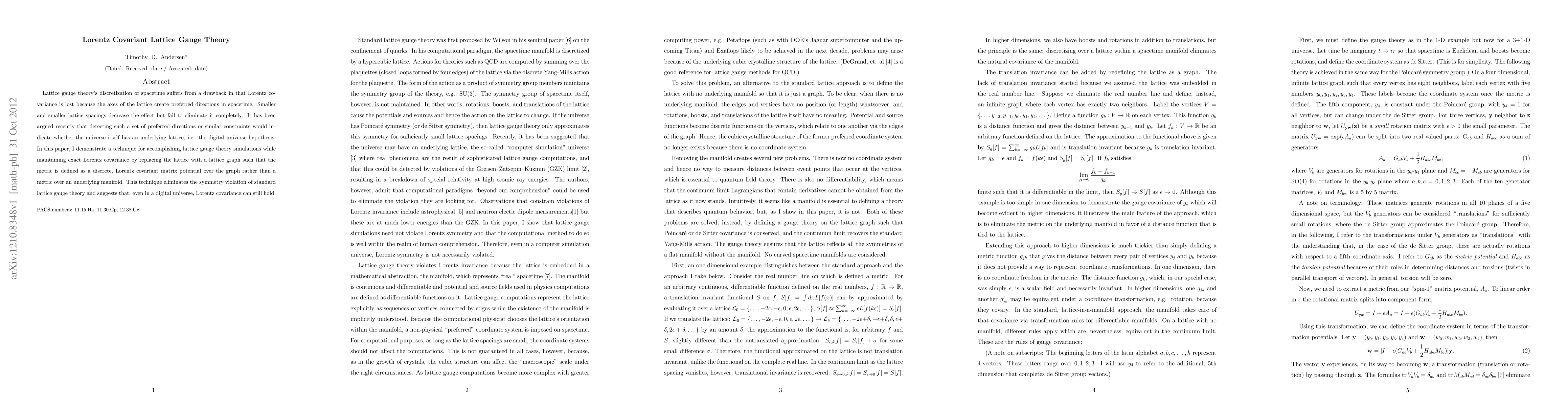 This paper presents a method to maintain exact Lorentz covariance in lattice gauge theory by using a lattice graph instead of a traditional lattice, defining a discrete, Lorentz covariant matrix potential over the graph. This approach eliminates the symmetry violation inherent in standard lattice gauge theory, suggesting that Lorentz covariance can be preserved even if the universe has a digital underlying structure.