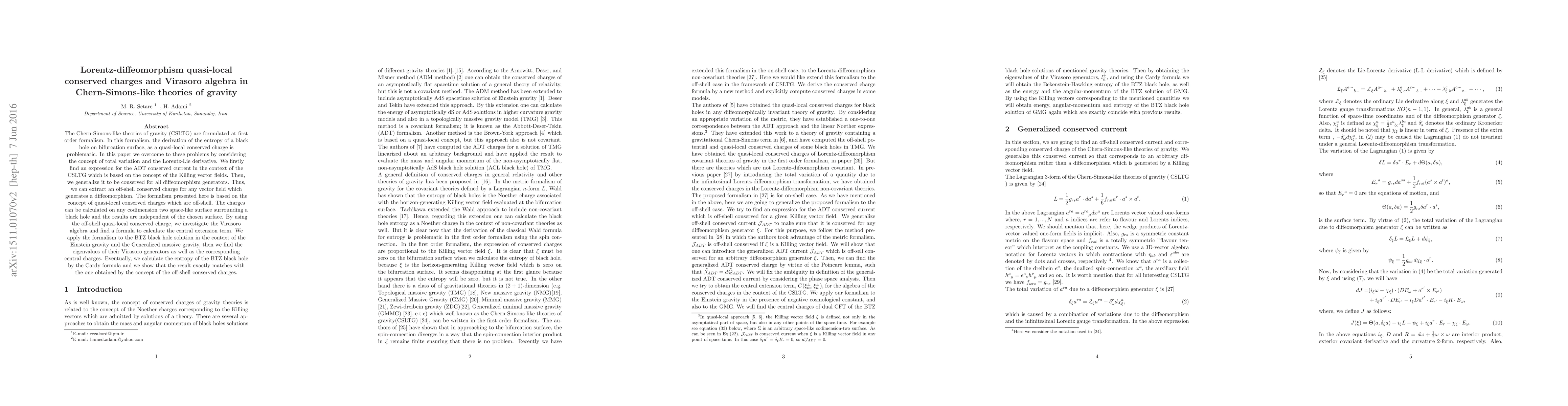 The Chern-Simons-like theories of gravity (CSLTG) are formulated at first order formalism. In this formalism, the derivation of the entropy of a black hole on bifurcation surface, as a quasi-local conserved charge is problematic. In this paper we overcome to these problems by considering the concept of total variation and the Lorentz-Lie derivative. We firstly find an expression for the ADT conserved current in the context of the CSLTG which is based on the concept of the Killing vector fields. Then, we generalize it to be conserved for all diffeomorphism generators. Thus, we can extract an off-shell conserved charge for any vector field which generates a diffeomorphism. The formalism presented here is based on the concept of quasi-local conserved charges which are off-shell. The charges can be calculated on any codimension two space-like surface surrounding a black hole and the results are independent of the chosen surface. By using the off-shell quasi-local conserved charge, we investigate the Virasoro algebra and find a formula to calculate the central extension term. We apply the formalism to the BTZ black hole solution in the context of the Einstein gravity and the Generalized massive gravity, then we find the eigenvalues of their Virasoro generators as well as the corresponding central charges. Eventually, we calculate the entropy of the BTZ black hole by the Cardy formula and we show that the result exactly matches with the one obtained by the concept of the off-shell conserved charges.