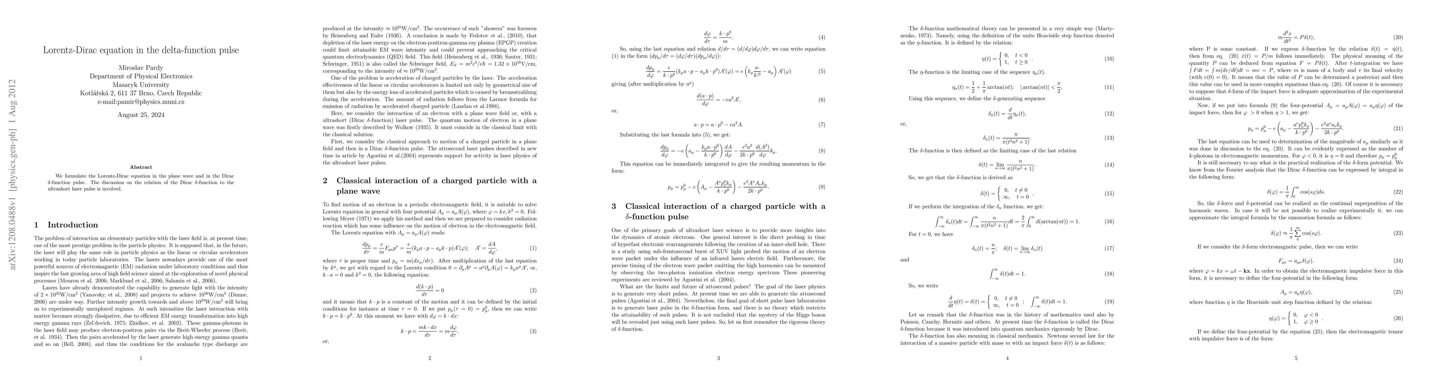 This paper formulates the Lorentz-Dirac equation for both plane waves and Dirac delta-function pulses, exploring the connection between the delta-function and ultrashort laser pulses. The study highlights the implications for understanding electromagnetic interactions in ultrafast regimes.