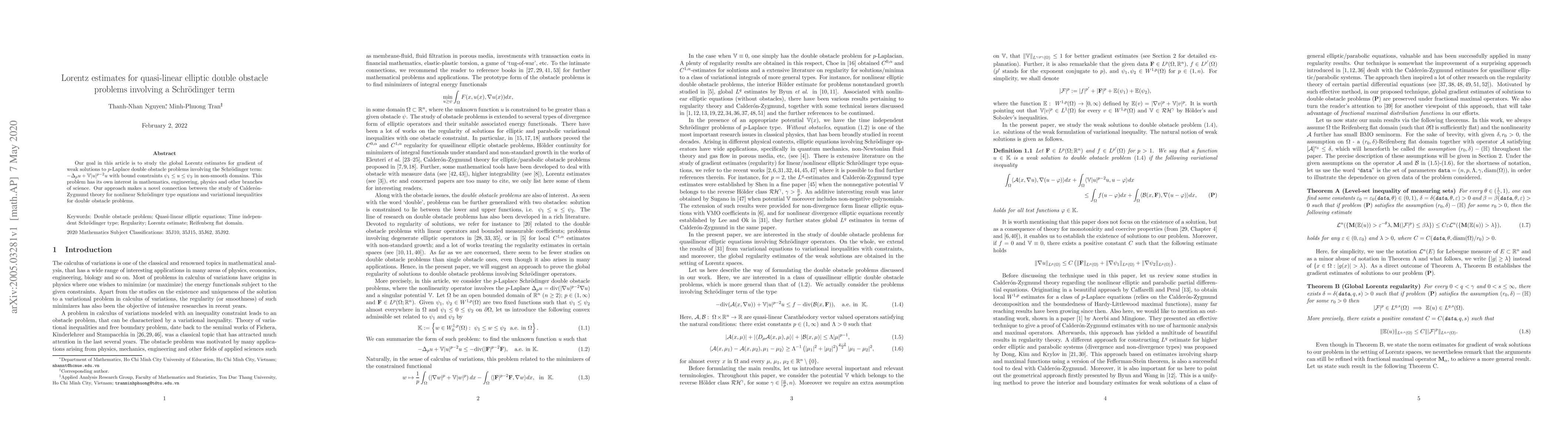 Our goal in this article is to study the global Lorentz estimates for gradient of weak solutions to $p$-Laplace double obstacle problems involving the Schr\"odinger term: $-\Delta_p u + \mathbb{V}|u|^{p-2}u$ with bound constraints $\psi_1 \le u \le \psi_2$ in non-smooth domains. This problem has its own interest in mathematics, engineering, physics and other branches of science. Our approach makes a novel connection between the study of Calder\'on-Zygmund theory for nonlinear Schr\"odinger type equations and variational inequalities for double obstacle problems.