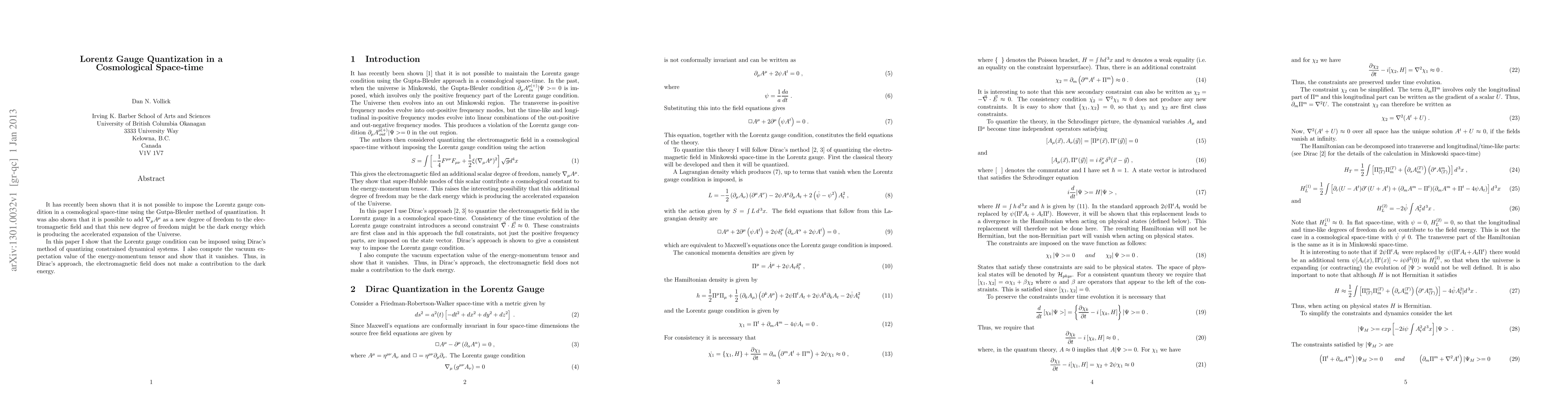 It has recently been shown that it is not possible to impose the Lorentz gauge condition in a cosmological space-time using the Gutpa-Bleuler method of quantization. It was also shown that it is possible to add $\nabla_{\mu}A^{\mu}$ as a new degree of freedom to the electromagnetic field and that this new degree of freedom might be the dark energy which is producing the accelerated expansion of the Universe. In this paper I show that the Lorentz gauge condition can be imposed using Dirac's method of quantizing constrained dynamical systems. I also compute the vacuum expectation value of the energy-momentum tensor and show that it vanishes. Thus, in Dirac's approach, the electromagnetic field does not make a contribution to the dark energy.