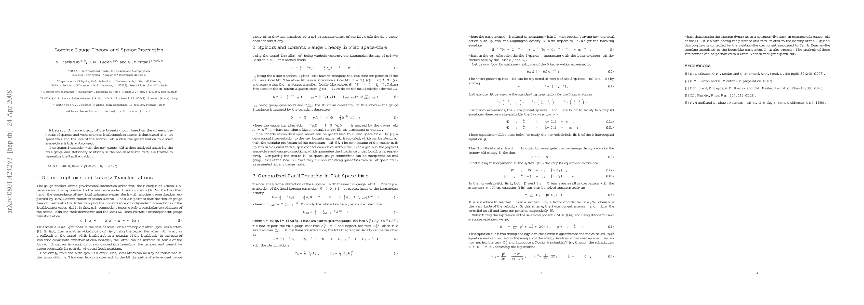 This work stands out by proposing a gauge theory for the Lorentz group based on the distinct behavior of spinors and vectors under local transformations, and by analyzing spinor interactions with a new gauge field to generalize the Pauli equation in a non-relativistic context.