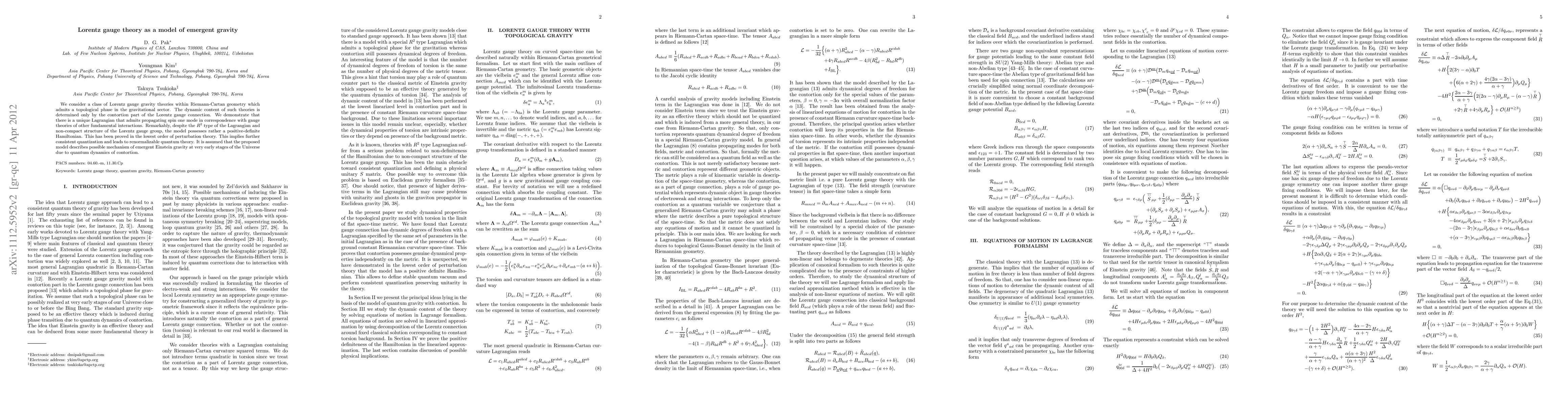 This paper explores Lorentz gauge gravity theories within Riemann-Cartan geometry, demonstrating a unique Lagrangian that corresponds to a propagating spin one mode. The model, despite its R^2 Lagrangian and non-compact structure, possesses a positive-definite Hamiltonian, suggesting consistent quantization and a renormalizable quantum theory, potentially describing emergent Einstein gravity.