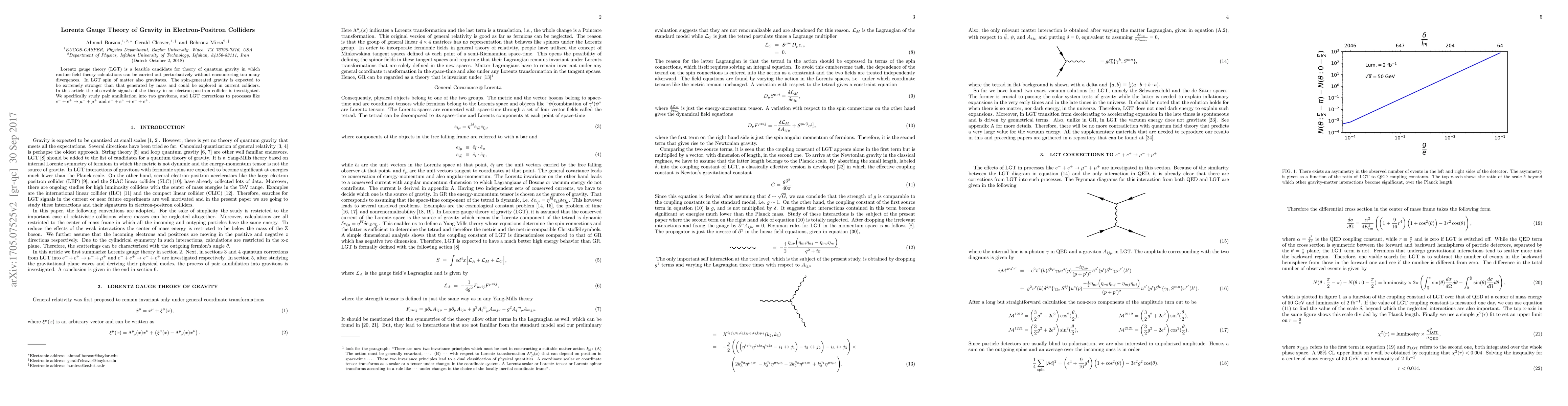 Lorentz gauge theory (LGT) is a feasible candidate for theory of quantum gravity in which routine field theory calculations can be carried out perturbatively without encountering too many divergences. In LGT spin of matter also gravitates. The spin-generated gravity is expected to be extremely stronger than that generated by mass and could be explored in current colliders. In this article the observable signals of the theory in an electron-positron collider is investigated. We specifically study pair annihilation into two gravitons, and LGT corrections to processes like $e^-+e^+\rightarrow \mu^-+\mu^+$ and $e^-+e^+\rightarrow e^-+e^+$.