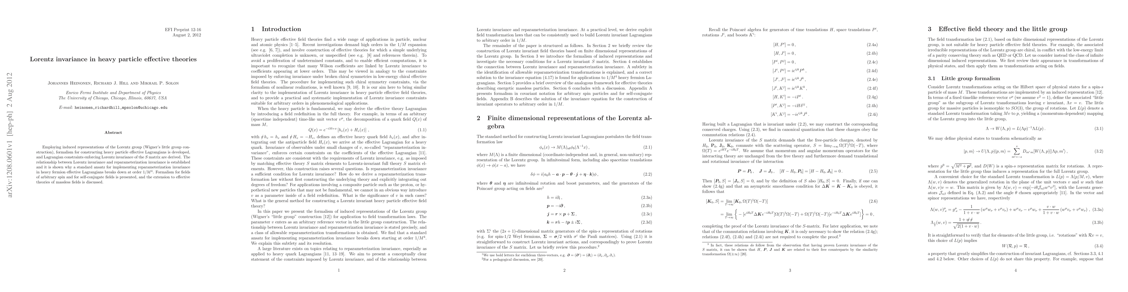 Employing induced representations of the Lorentz group (Wigner's little group construction), formalism for constructing heavy particle effective Lagrangians is developed, and Lagrangian constraints enforcing Lorentz invariance of the S matrix are derived. The relationship between Lorentz invariance and reparameterization invariance is established and it is shown why a standard ansatz for implementing reparameterization invariance in heavy fermion effective Lagrangians breaks down at order 1/M^4. Formalism for fields of arbitrary spin and for self-conjugate fields is presented, and the extension to effective theories of massless fields is discussed.