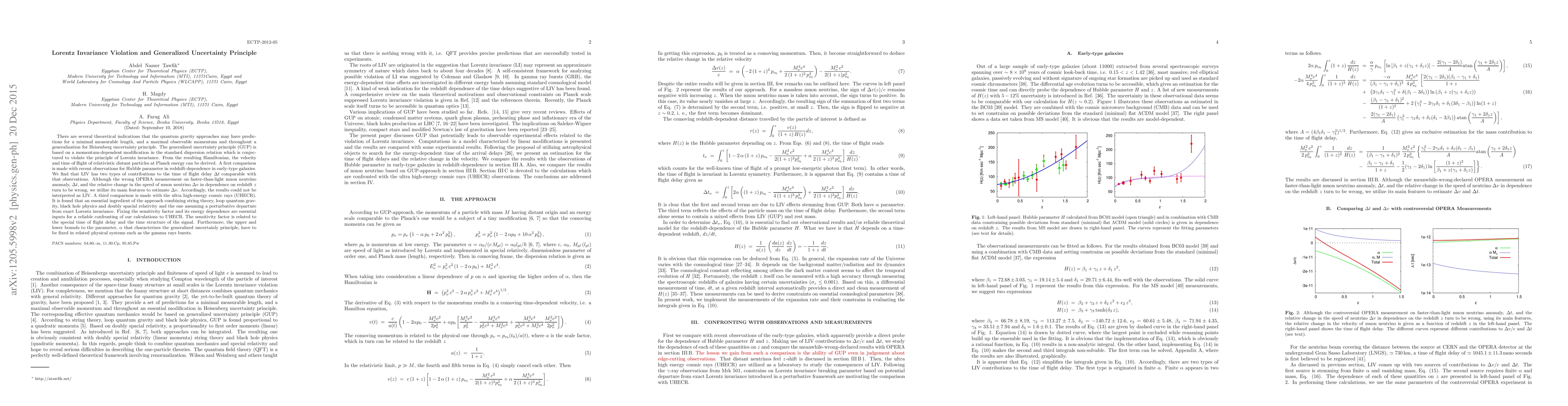 There are several theoretical indications that the quantum gravity approaches may have predictions for a minimal measurable length, and a maximal observable momentum and throughout a generalization for Heisenberg uncertainty principle. The generalized uncertainty principle (GUP) is based on a momentum-dependent modification in the standard dispersion relation which is conjectured to violate the principle of Lorentz invariance. From the resulting Hamiltonian, the velocity and time of flight of relativistic distant particles at Planck energy can be derived. A first comparison is made with recent observations for Hubble parameter in redshift-dependence in early-type galaxies. We find that LIV has two types of contributions to the time of flight delay $\Delta t$ comparable with that observations. Although the wrong OPERA measurement on faster-than-light muon neutrino anomaly, $\Delta t$, and the relative change in the speed of muon neutrino $\Delta v$ in dependence on redshift $z$ turn to be wrong, we utilize its main features to estimate $\Delta v$. Accordingly, the results could not be interpreted as LIV. A third comparison is made with the ultra high-energy cosmic rays (UHECR). It is found that an essential ingredient of the approach combining string theory, loop quantum gravity, black hole physics and doubly spacial relativity and the one assuming a perturbative departure from exact Lorentz invariance. Fixing the sensitivity factor and its energy dependence are essential inputs for a reliable confronting of our calculations to UHECR. The sensitivity factor is related to the special time of flight delay and the time structure of the signal. Furthermore, the upper and lower bounds to the parameter, $\alpha$ that characterizes the generalized uncertainly principle, have to be fixed in related physical systems such as the gamma rays bursts.