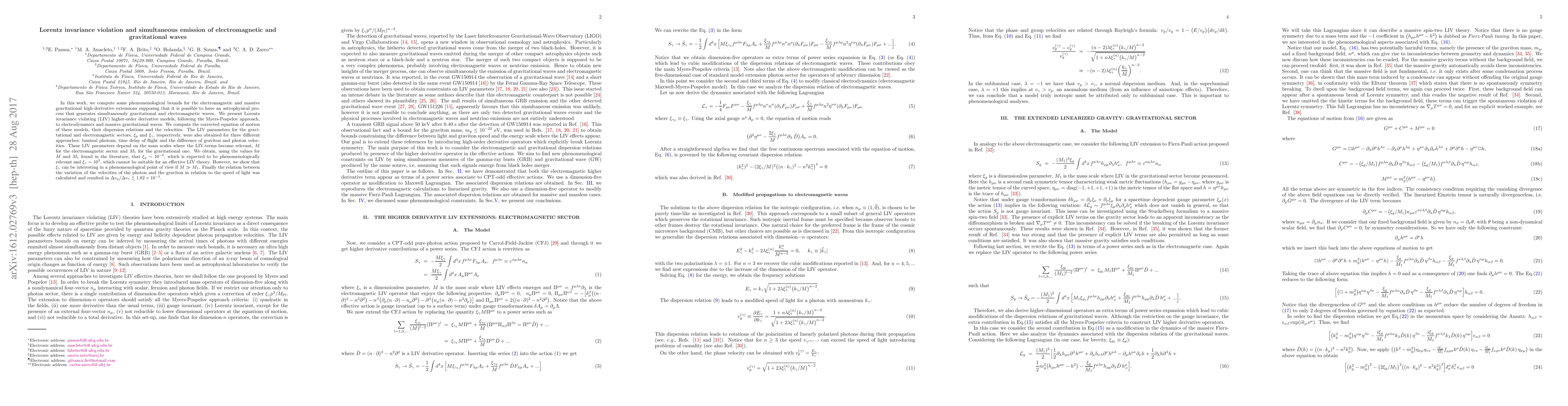 This research calculates bounds for simultaneous electromagnetic and gravitational wave emission, using Lorentz Invariance Violation (LIV) models. It finds phenomenologically relevant LIV parameters for gravity ($xi_g sim 10^{-2}$) and less suitable ones for electromagnetism ($xi_gamma sim 10^{3}$), but suggests $xi_gamma$ could be interesting if mass scales differ significantly. The study also determines a velocity variation ratio of graviton to photon relative to light speed, $Delta v_g/Delta v_gamma lesssim 1.82 imes 10^{-3}$.