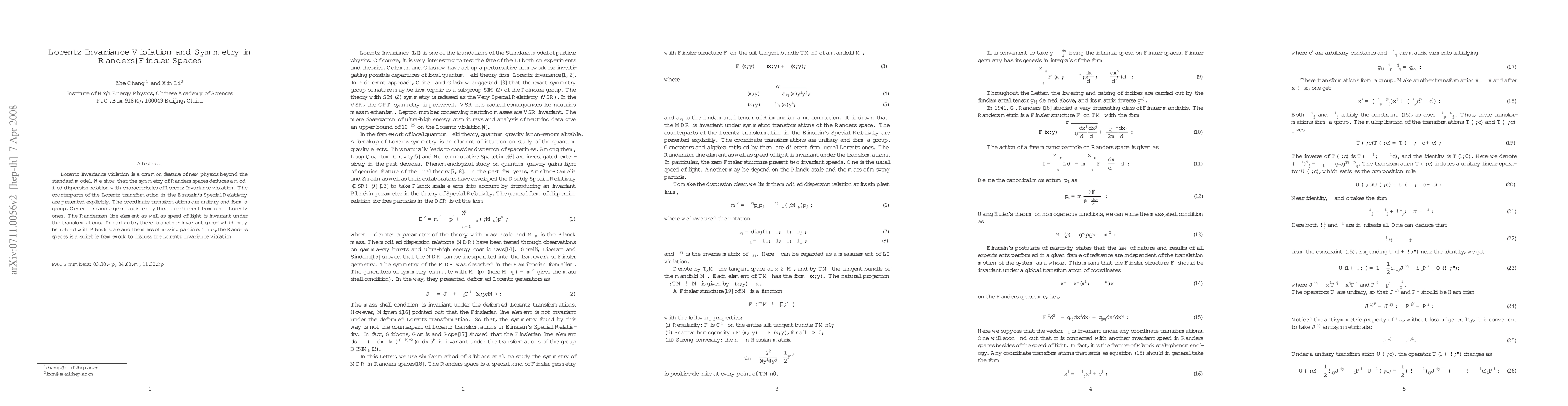 Lorentz Invariance violation is a common feature of new physics beyond the standard model. We show that the symmetry of Randers spaces deduces a modified dispersion relation with characteristics of Lorentz Invariance violation. The counterparts of the Lorentz transformation in the Einstein's Special Relativity are presented explicitly. The coordinate transformations are unitary and form a group. Generators and algebra satisfied by them are different from usual Lorentz ones. The Randersian line element as well as speed of light is invariant under the transformations. In particular, there is another invariant speed which may be related with Planck scale and the mass of moving particle. Thus, the Randers spaces is a suitable framework to discuss the Lorentz Invariance violation.