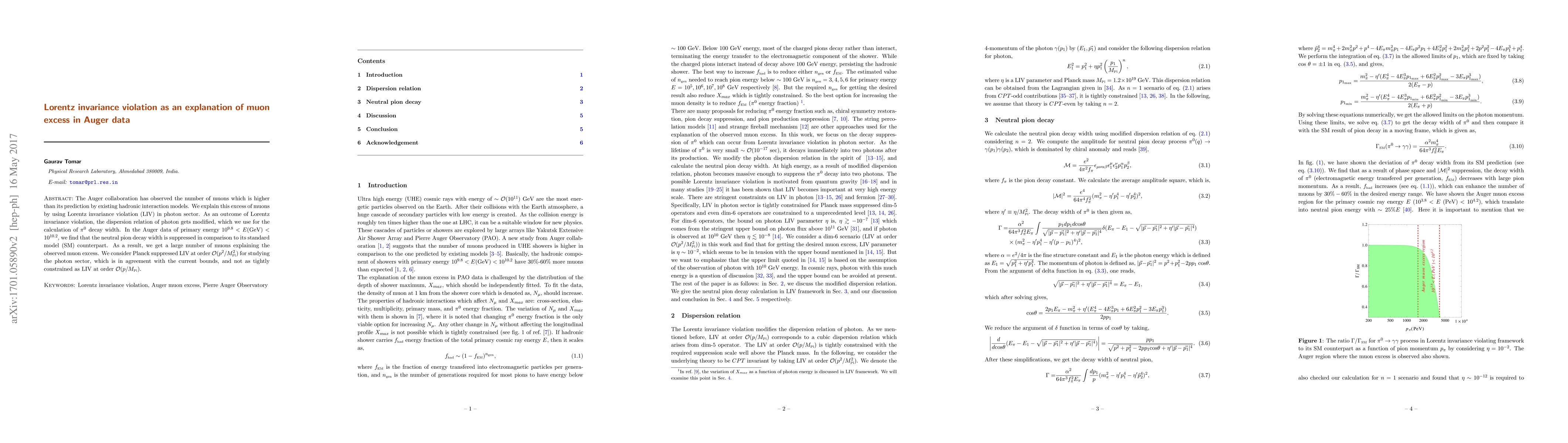 This paper proposes that Lorentz invariance violation in the photon sector can explain the observed excess of muons in the Auger data, attributing it to a modified dispersion relation that suppresses the decay width of neutral pions, resulting in more muons. The study considers Planck suppressed LIV at a specific order, consistent with current experimental bounds.