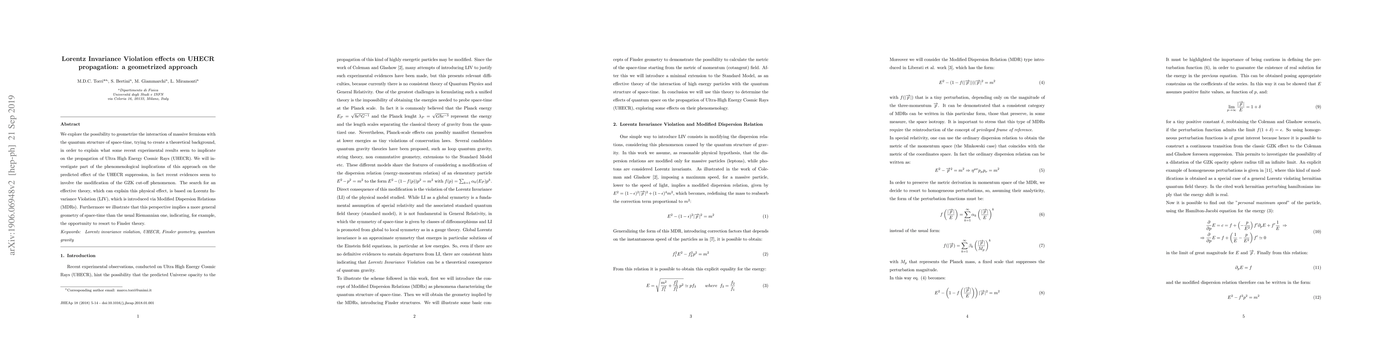 We explore the possibility to geometrize the interaction of massive fermions with the quantum structure of space-time, trying to create a theoretical background, in order to explain what some recent experimental results seem to implicate on the propagation of Ultra High Energy Cosmic Rays (UHECR). We will investigate part of the phenomenological implications of this approach on the predicted effect of the UHECR suppression, in fact recent evidences seem to involve the modification of the GZK cut-off phenomenon. The search for an effective theory, which can explain this physical effect, is based on Lorentz Invariance Violation (LIV), which is introduced via Modified Dispersion Relations (MDRs). Furthermore we illustrate that this perspective implies a more general geometry of space-time than the usual Riemannian one, indicating, for example, the opportunity to resort to Finsler theory.