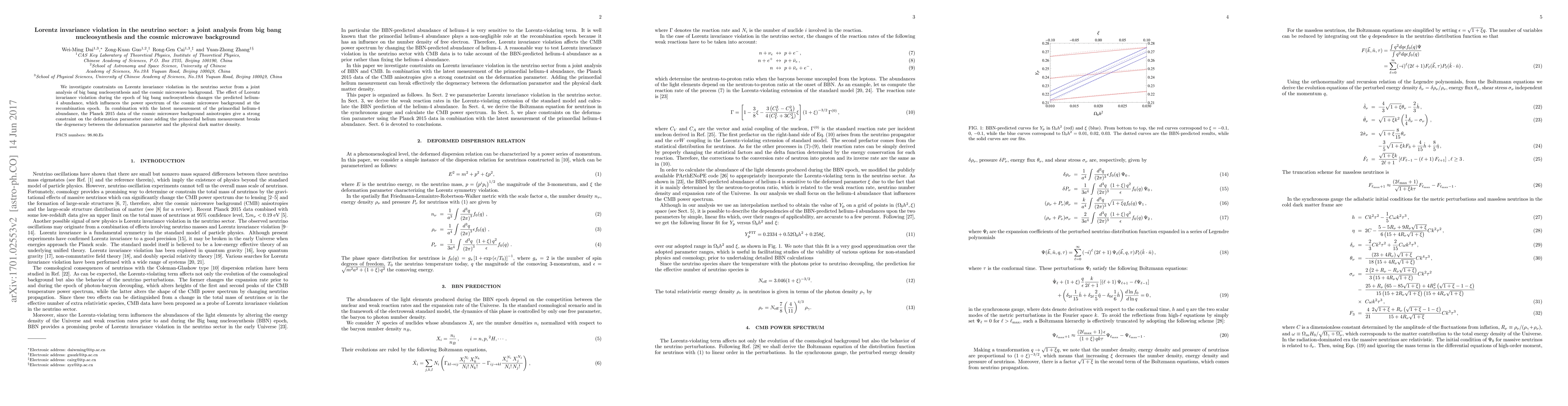 This paper investigates constraints on Lorentz invariance violation in the neutrino sector by analyzing the effects on big bang nucleosynthesis and the cosmic microwave background. The study finds that such violations influence helium-4 abundance and CMB power spectrum, leading to strong constraints on the deformation parameter when combined with recent helium-4 measurements and Planck 2015 CMB data.