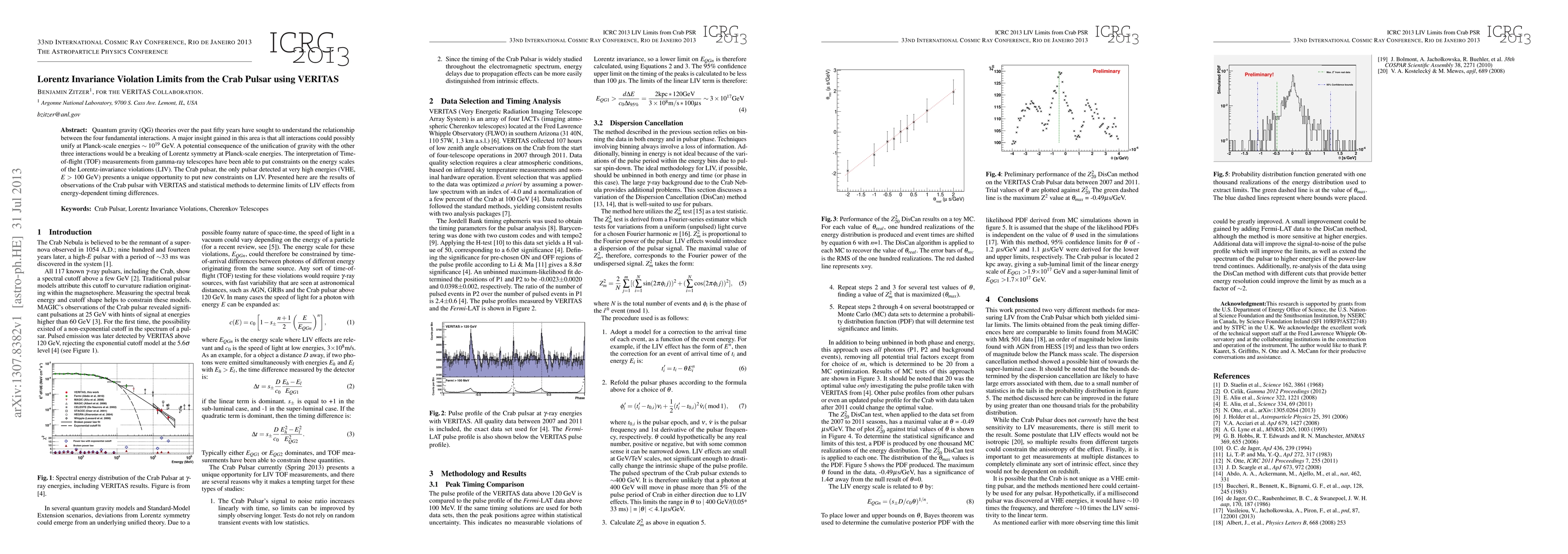The research used two different methods to measure LIV from the Crab Pulsar: peak timing differences and dispersion cancellation.