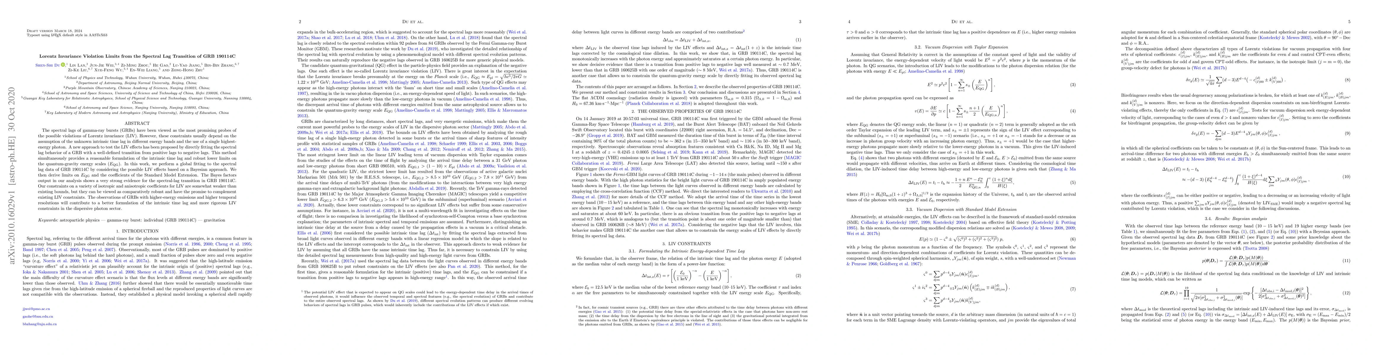This paper investigates Lorentz invariance violation (LIV) using the spectral lag transition of GRB 190114C, employing a Bayesian approach to derive robust lower limits on quantum-gravity energy scales. The results provide comparatively weaker but promising constraints on LIV coefficients, potentially complementing existing bounds with future higher-resolution GRB observations.