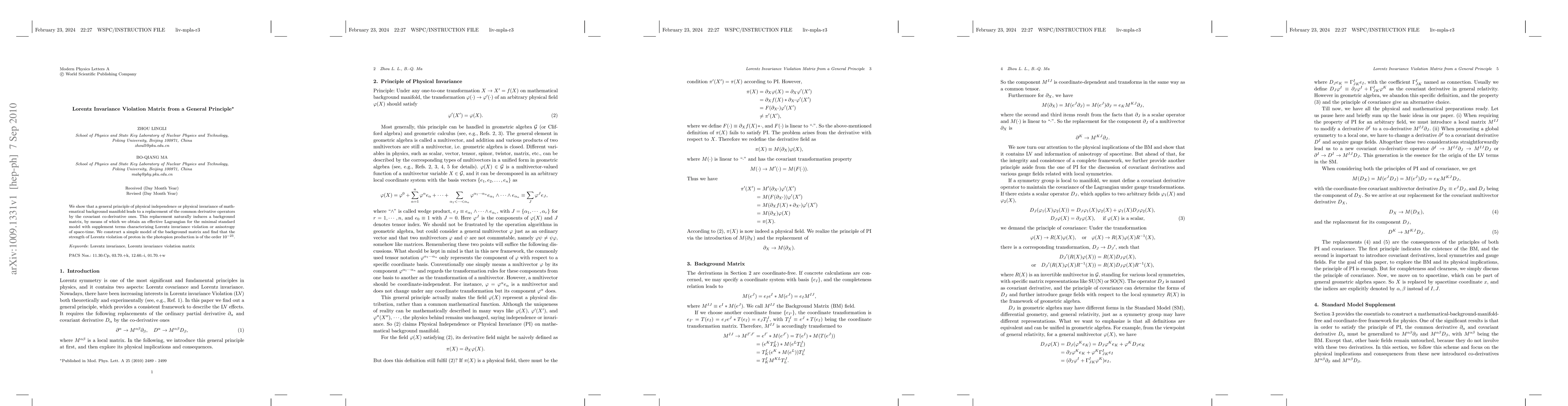 We show that a general principle of physical independence or physical invariance of mathematical background manifold leads to a replacement of the common derivative operators by the covariant co-derivative ones. This replacement naturally induces a background matrix, by means of which we obtain an effective Lagrangian for the minimal standard model with supplement terms characterizing Lorentz invariance violation or anisotropy of space-time. We construct a simple model of the background matrix and find that the strength of Lorentz violation of proton in the photopion production is of the order $10^{-23}$.