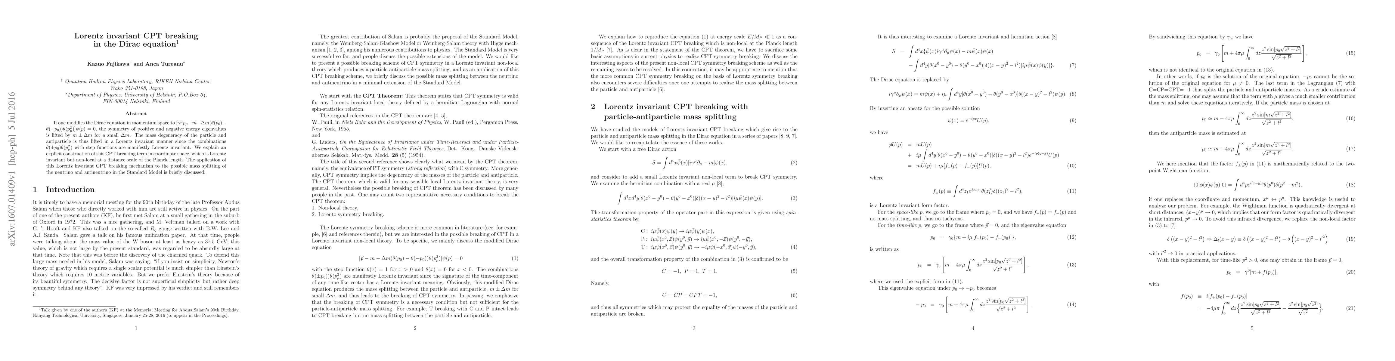 This paper explores a modified Dirac equation that introduces Lorentz invariant CPT breaking through a small mass term difference, lifting the mass degeneracy between particles and antiparticles. The proposed mechanism is non-local at the Planck length scale and is briefly applied to the potential mass splitting of neutrinos and antineutrinos.