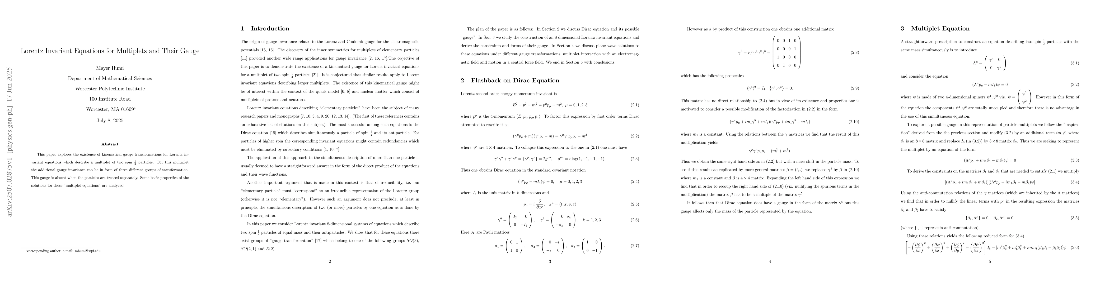 This paper explores the existence of kinematical gauge transformations for Lorentz invariant equations which describe a multiplet of two spin $\frac{1}{2}$ particles. For this multiplet the additional gauge invariance can be in form of three different groups of transformation. This gauge is absent when the particles are treated separately. Some basic properties of the solutions for these "multiplet equations" are analyzed.