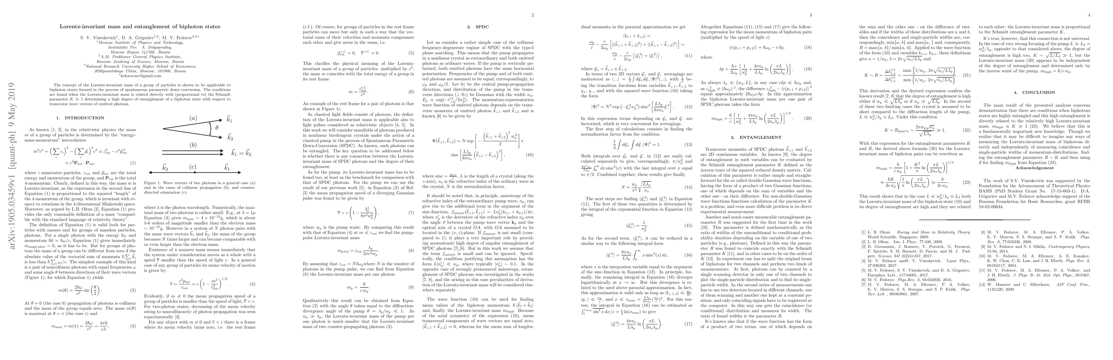 The concept of the Lorentz-invariant mass of a group of particles is shown to be applicable to biphoton states formed in the process of spontaneous parametric down conversion. The conditions are found when the Lorentz-invariant mass is related directly with (proportional to) the Schmidt parameter $K\gg 1$ determining a high degree of entanglement of a biphoton state with respect to transverse wave vectors of emitted photons.