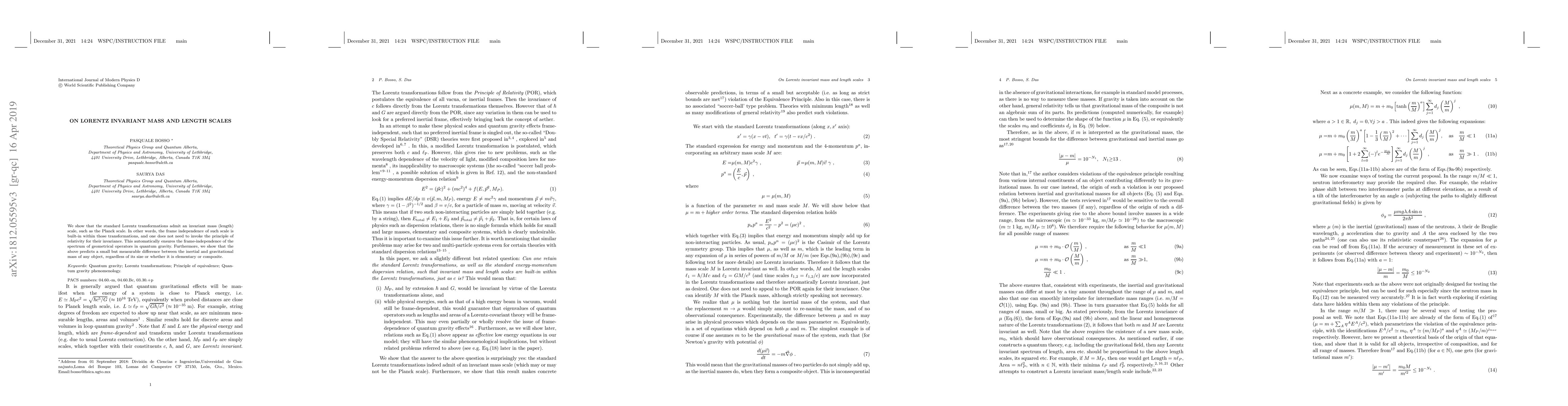 We show that the standard Lorentz transformations admit an invariant mass (length) scale, such as the Planck scale. In other words, the frame independence of such scale is built-in within those transformations, and one does not need to invoke the principle of relativity for their invariance. This automatically ensures the frame-independence of the spectrum of geometrical operators in quantum gravity. Furthermore, we show that the above predicts a small but measurable difference between the inertial and gravitational mass of any object, regardless of its size or whether it is elementary or composite.
