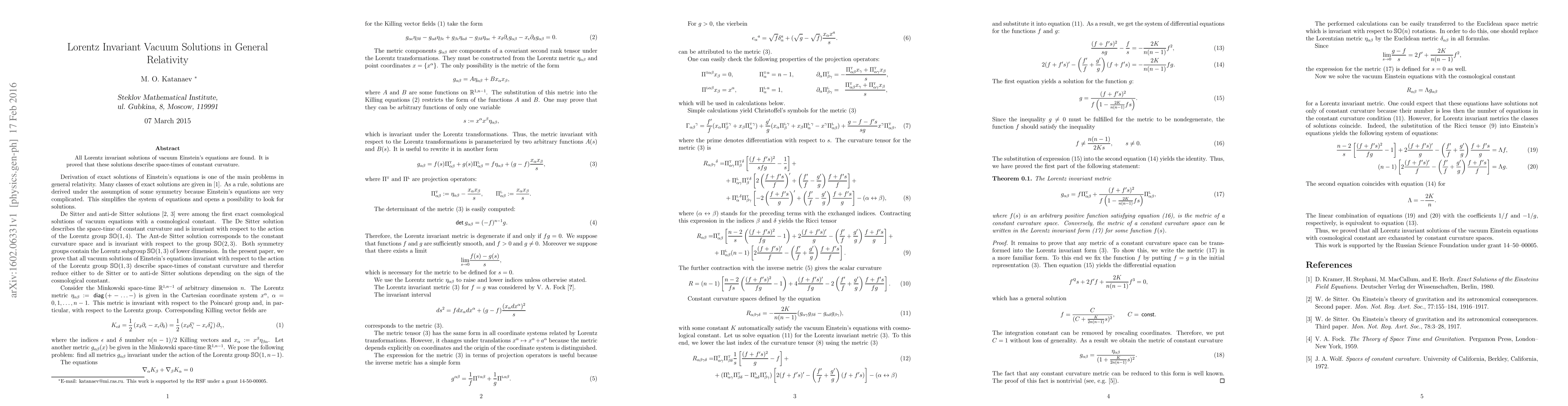 All Lorentz invariant solutions of vacuum Einstein's equations are found. It is proved that these solutions describe space-times of constant curvature.