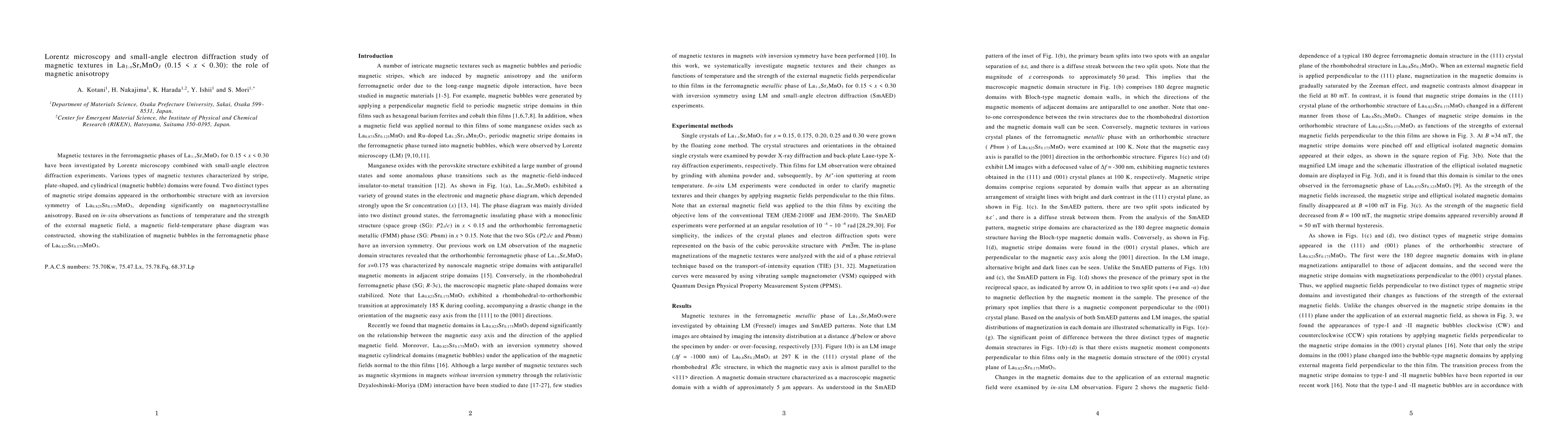 Magnetic textures in the ferromagnetic phases of La$_{1-x}$Sr$_x$MnO$_3$ for 0.15 $< x <$ 0.30 have been investigated by Lorentz microscopy combined with small-angle electron diffraction experiments. Various types of magnetic textures characterized by stripe, plate-shaped, and cylindrical (magnetic bubble) domains were found. Two distinct types of magnetic stripe domains appeared in the orthorhombic structure with an inversion symmetry of La$_{0.825}$Sr$_{0.175}$MnO$_3$, depending significantly on magnetocrystalline anisotropy. Based on in-situ observations as functions of temperature and the strength of the external magnetic field, a magnetic field-temperature phase diagram was constructed, showing the stabilization of magnetic bubbles in the ferromagnetic phase of La$_{0.825}$Sr$_{0.175}$MnO$_3$.