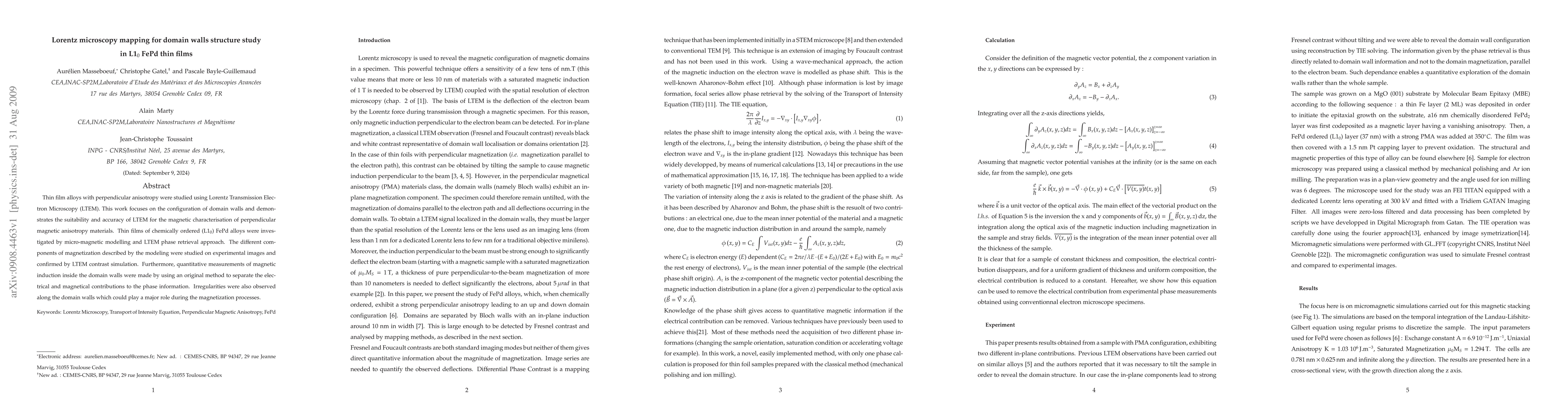 Thin film alloys with perpendicular anisotropy were studied using Lorentz Transmission Electron Microscopy (LTEM). This work focuses on the configuration of domain walls and demonstrates the suitability and accuracy of LTEM for the magnetic characterisation of perpendicular magnetic anisotropy materials. Thin films of chemically ordered ($\unit{L1_0}$) FePd alloys were investigated by micro-magnetic modelling and LTEM phase retrieval approach. The different components of magnetization described by the modeling were studied on experimental images and confirmed by LTEM contrast simulation. Furthermore, quantitative measurements of magnetic induction inside the domain walls were made by using an original method to separate the electrical and magnetical contributions to the phase information. Irregularities were also observed along the domain walls which could play a major role during the magnetization processes.