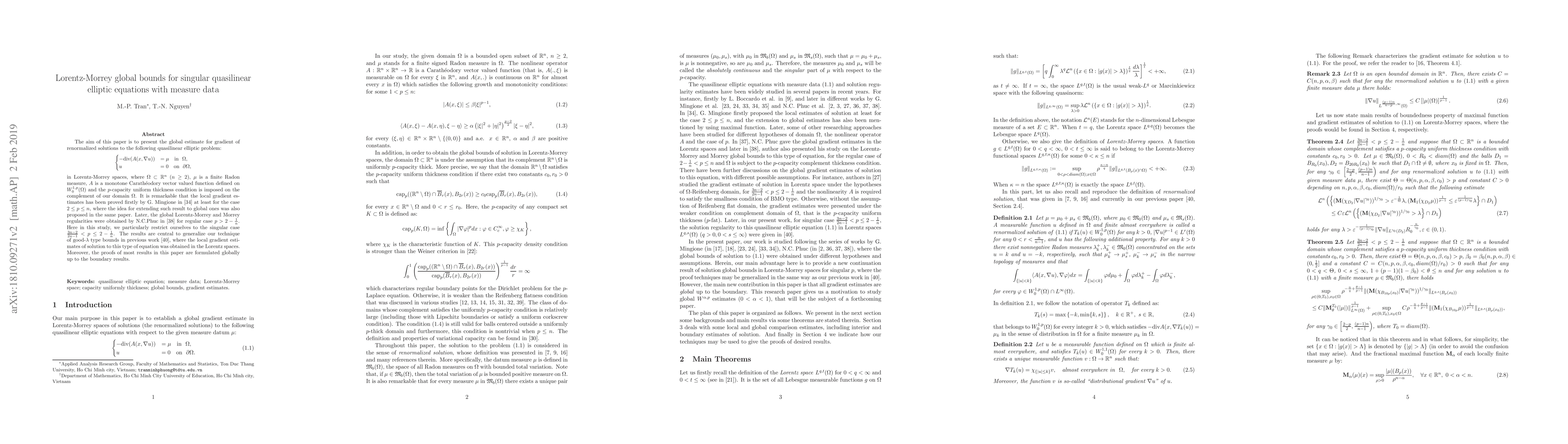 This paper establishes global gradient estimates for renormalized solutions to singular quasilinear elliptic equations with measure data in Lorentz-Morrey spaces. It extends previous local gradient estimates and generalizes techniques from earlier work to handle the singular case of the equation.