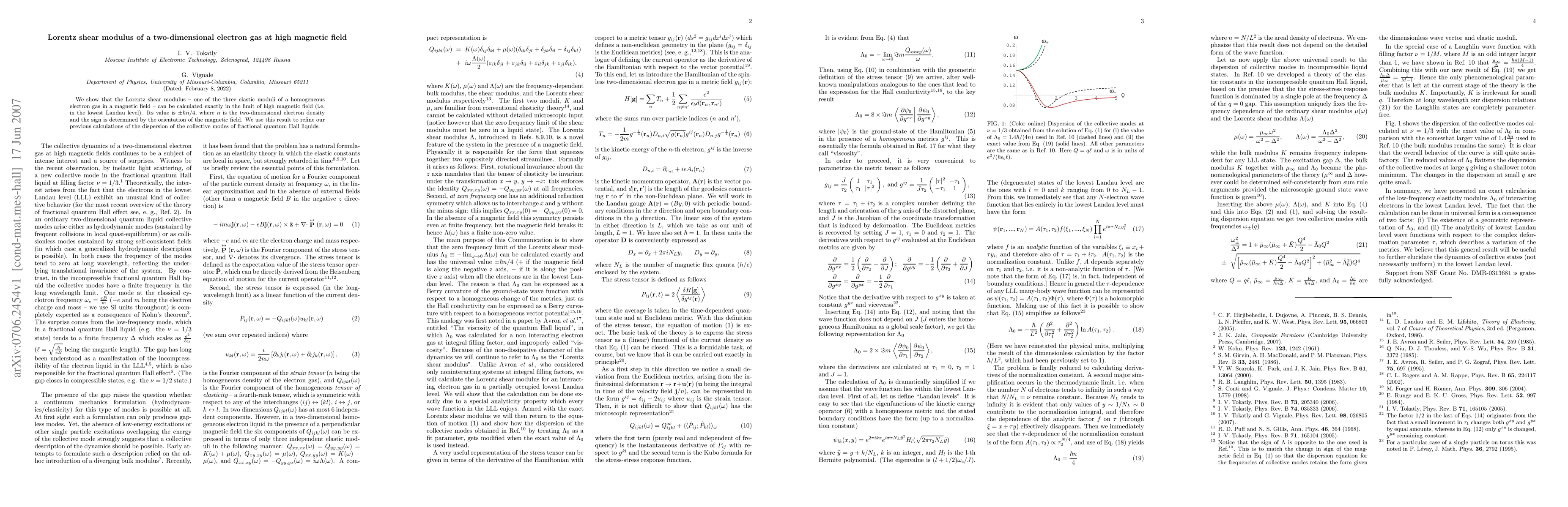 This paper calculates the Lorentz shear modulus for a two-dimensional electron gas under high magnetic fields, finding it to be $\pm \hbar n/4$, where $n$ is the electron density and the sign depends on the magnetic field orientation. This result refines prior calculations of collective mode dispersion in fractional quantum Hall liquids.